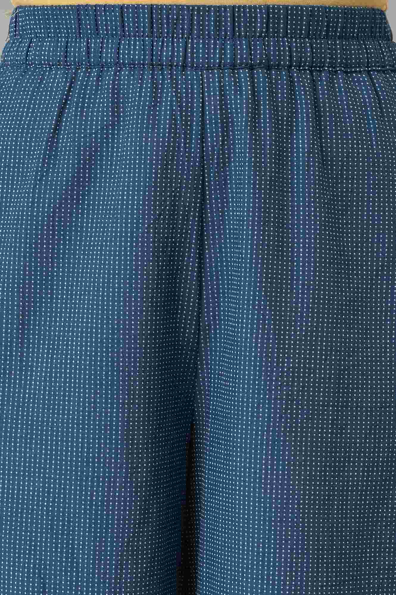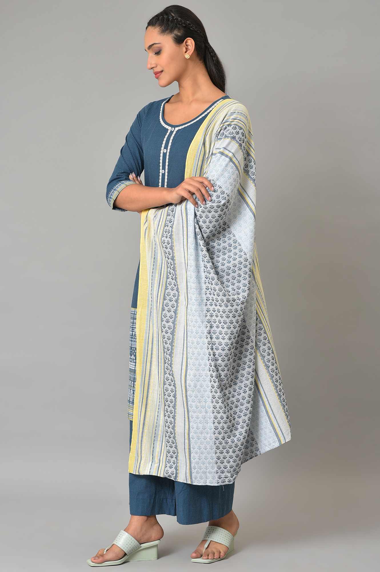 This Three-Piece kurta Set Includes A Body-Skimming Straight kurta, A Straight Palazzo And A Complimenting Dobby Dupatta. Crafted In Intricately Woven Yarns, It Features Floral Motifs In Shades Of Blues, White And Yellow.