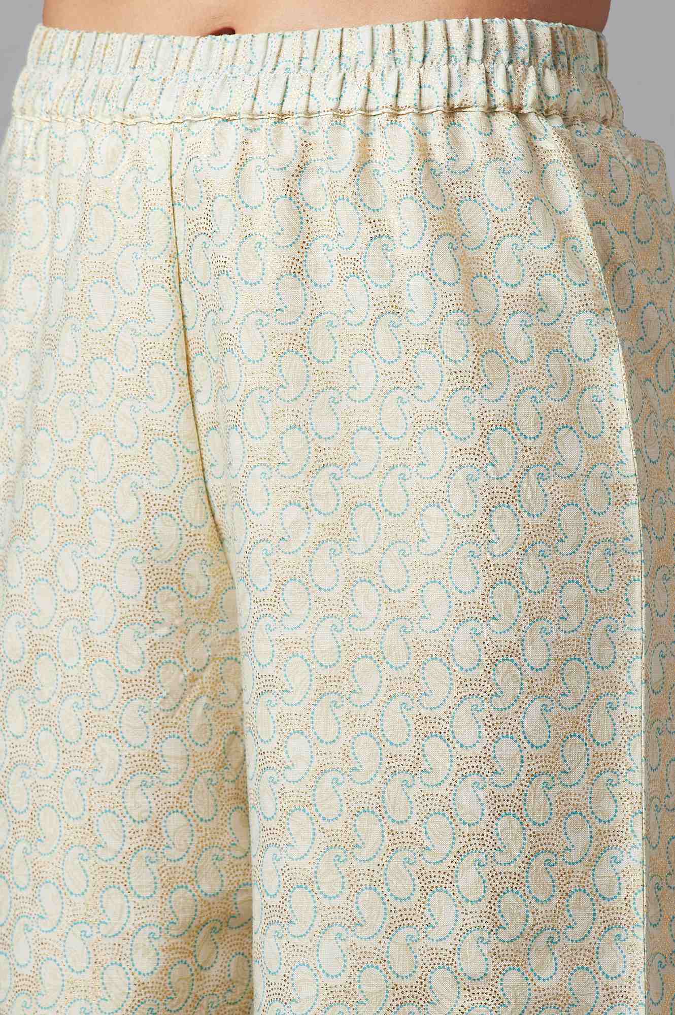 Elegant yet stylish, this light festive kurta set is a must-have for summer wardrobe. Get the chic look in this ethnic set by Aurelia. The set includes blue printed kurta in straight silhouette and it is paired with white flared palazzo. The set also comes with a white dupatta.