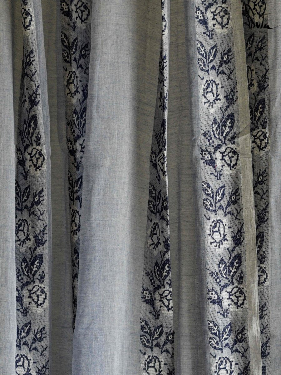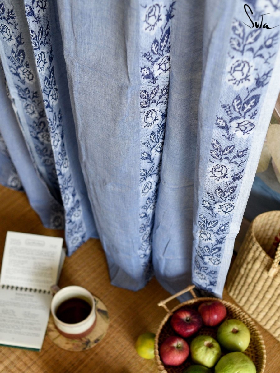 Suta’s signature ‘made in heaven’ mul cotton, is also known as mul mul in West Bengal. The fabric is buttery soft and has a delicate beauty. Its weave is very fine and this lends a very fluid texture to the fabric. These curtains also feature woven floral motifs to add an air of sophistication to the fabric.