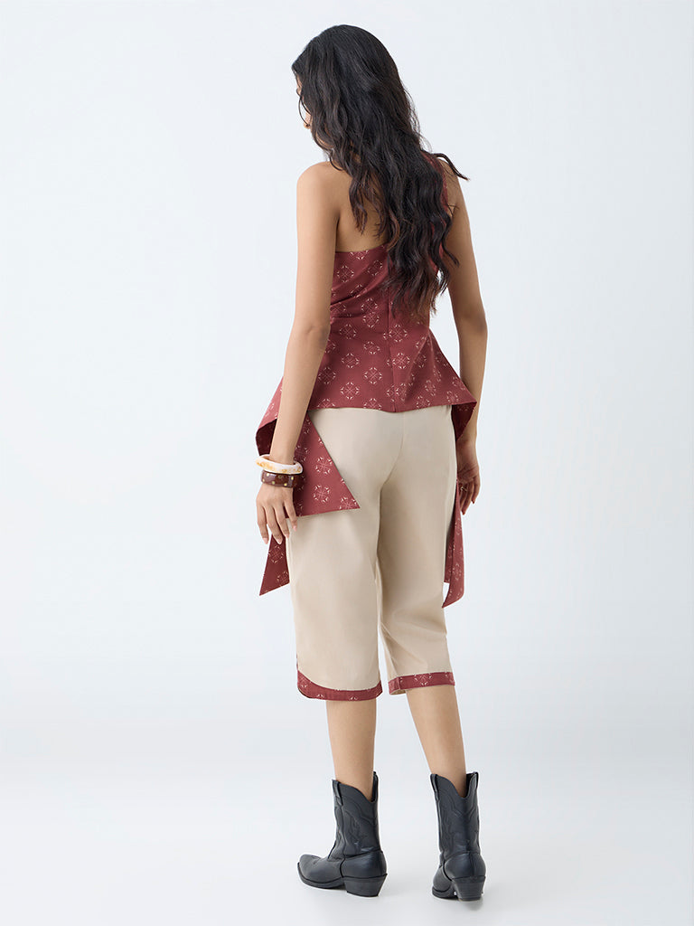 Reimagine casual elegance with these beige capris from Bombay Paisley. Crafted from pure cotton, they offer a tailored silhouette that flatters effortlessly. Equipped with a buttoned waistband, belt loops, zipper placket, and functional side pockets, they balance practicality with style.