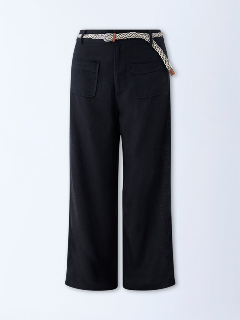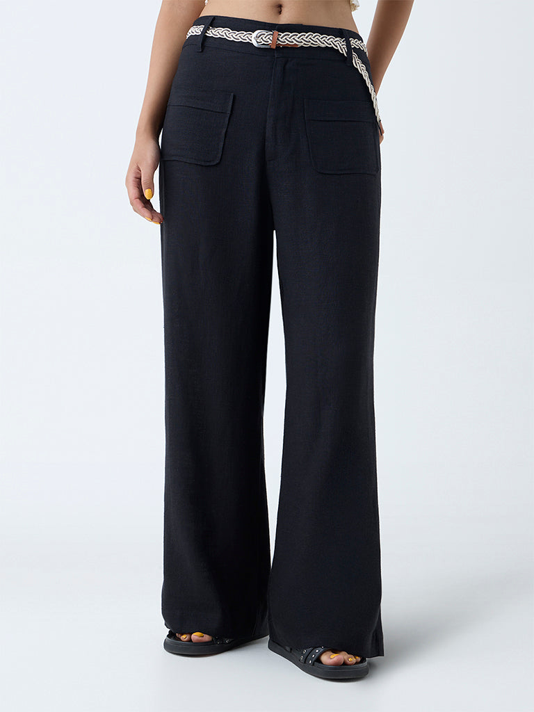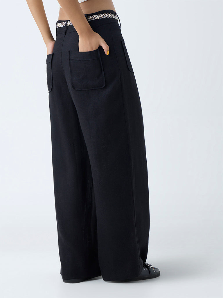 These black pants from Bombay Paisley are tailored from a sumptuous linen-blend fabric that balances structure with breathability. Designed with a buttoned waistband, belt loops, and a detachable belt, they allow for a customised fit. Multiple pockets and a zipper fly add a utilitarian edge, while the flared silhouette enhances ease of movement.