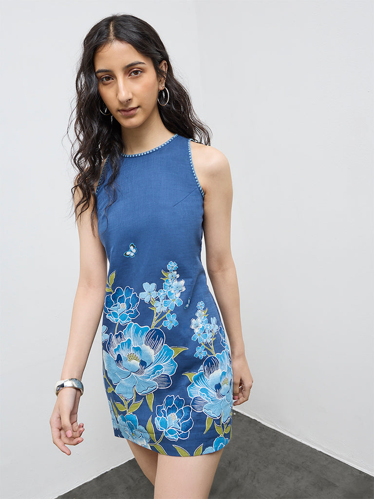 Bombay Paisley presents this blue dress crafted in a straight silhouette. Designed with a round neckline and a sleeveless cut, it is finished with floral detailing at the front for added definition. A secure button closure at the back ensures ease of wear, completing the look with an effortless finish.
