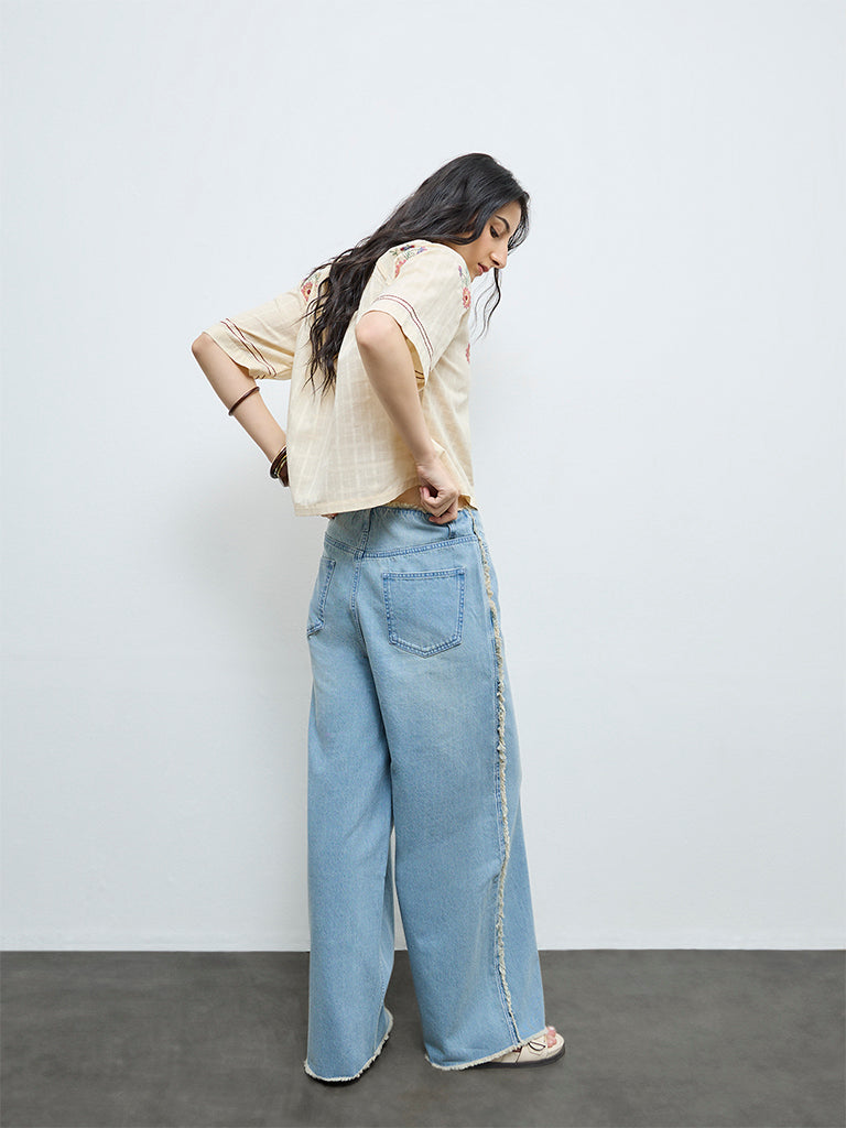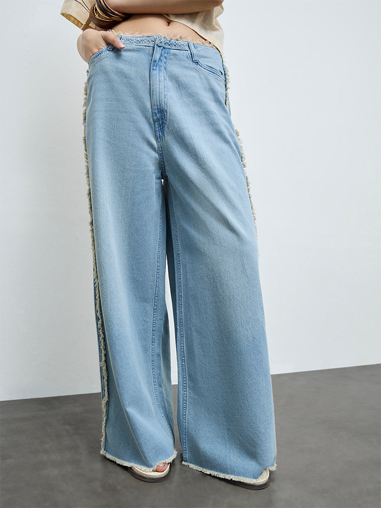 Bringing a relaxed twist to everyday denim, these light blue washed jeans from Bombay Paisley are crafted from pure cotton. Designed with a secure button and zipper-fly closure, they feature multiple pockets for functional ease. Fringe detailing along the sides adds a subtle bohemian edge.