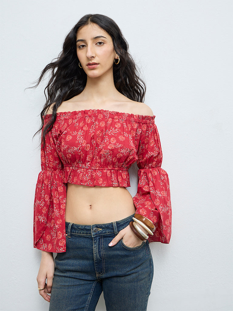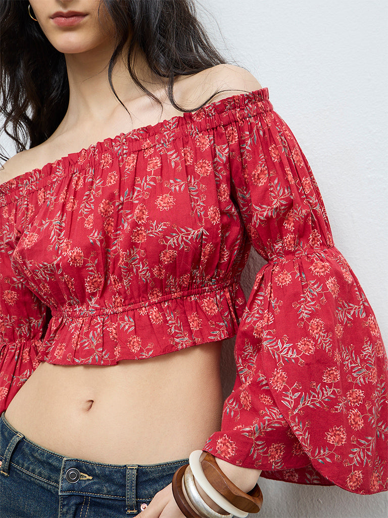 Bombay Paisley presents this red top adorned with delicate floral prints. Crafted from pure cotton for breathable comfort, it is shaped in an off-shoulder silhouette with flared sleeves that add gentle movement.