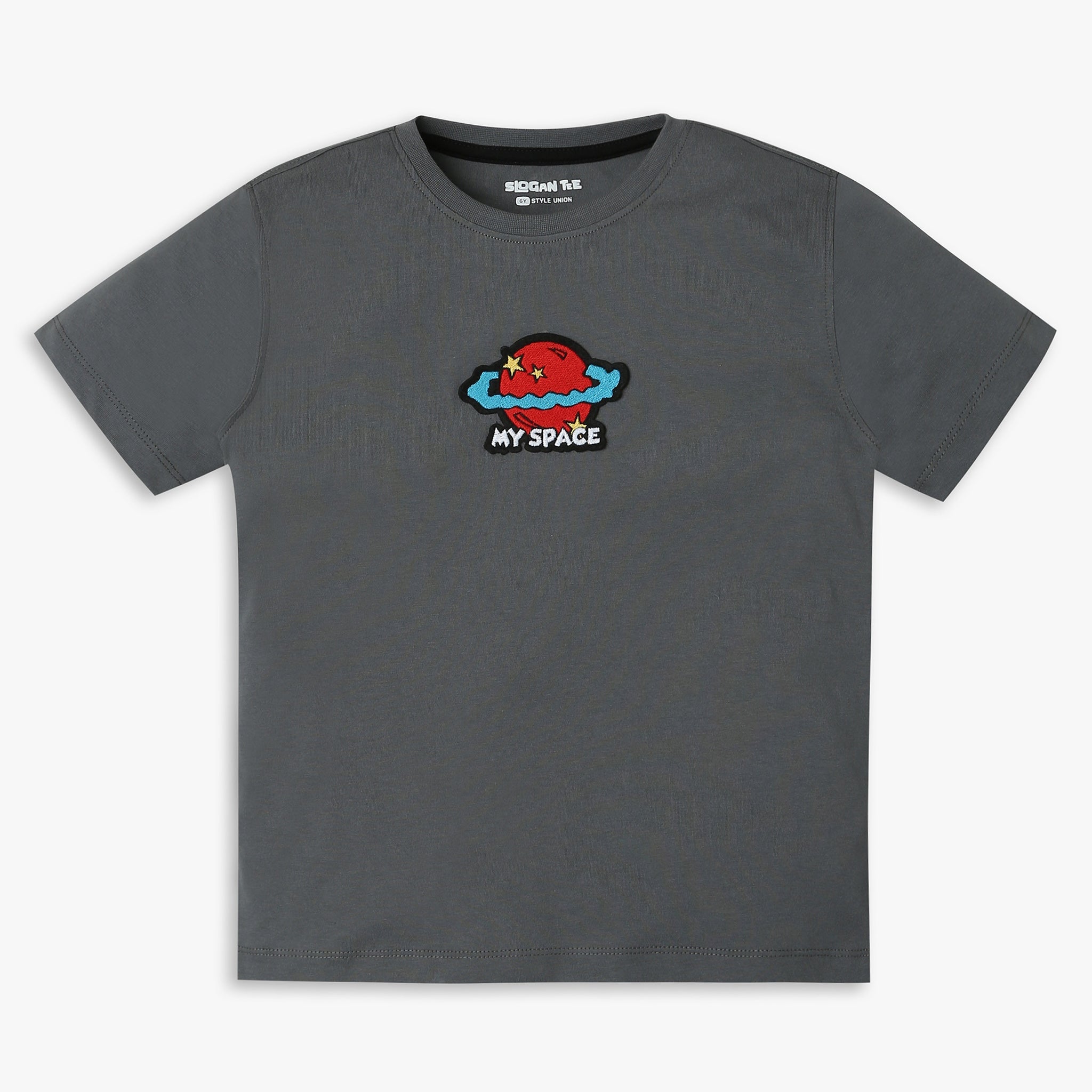 These solid pattern t-shirt has crew neck and half sleeve. Made from cotton, your kid's feel comfortable wearing the product.