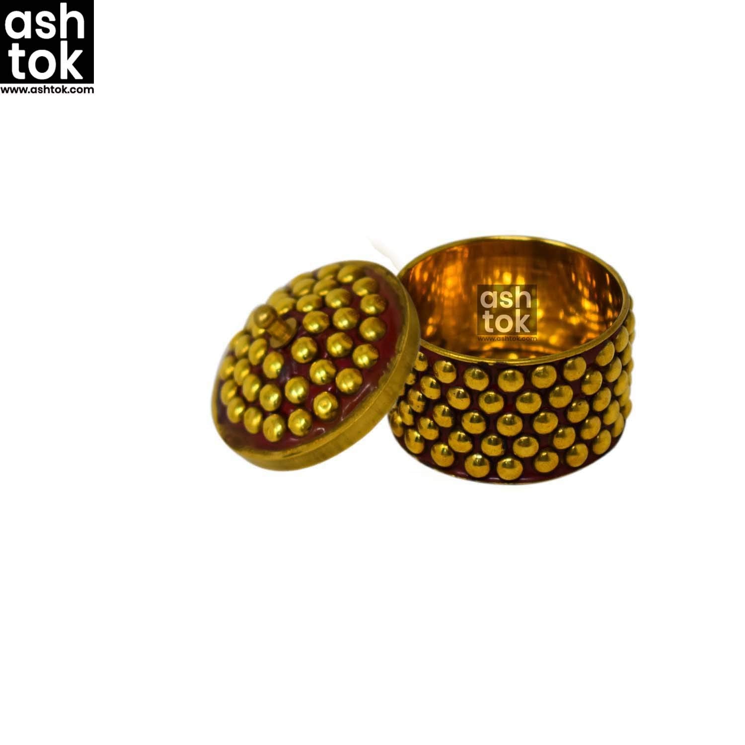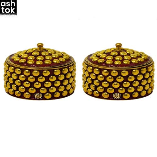 Brass Kumkum Box, Brass box handcrafted round shape,Sindoor Dani Sindoor Dabbi, Dotted Design, Color Red, 2x2 Inch, Gift Item (Pack of 2 Pcs)
