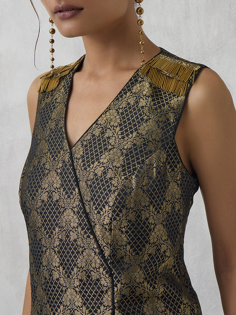 Elevated with opulence, this sleeveless black top is crafted in a rich brocade weave featuring intricate gold floral motifs against a lattice base. Cut in a wrap-inspired silhouette with a deep V-neckline, it sculpts a flattering fit while exuding modern elegance. The shoulders are adorned with metallic tassel detailing, adding a statement festive accent that catches the light beautifully.
