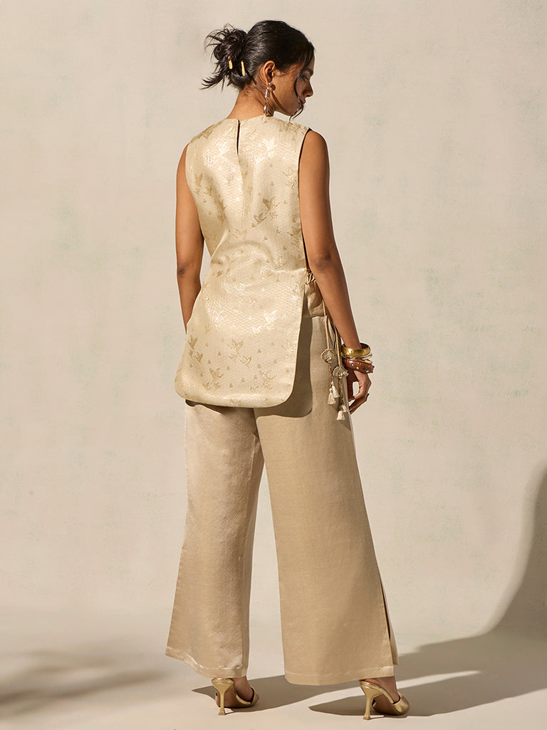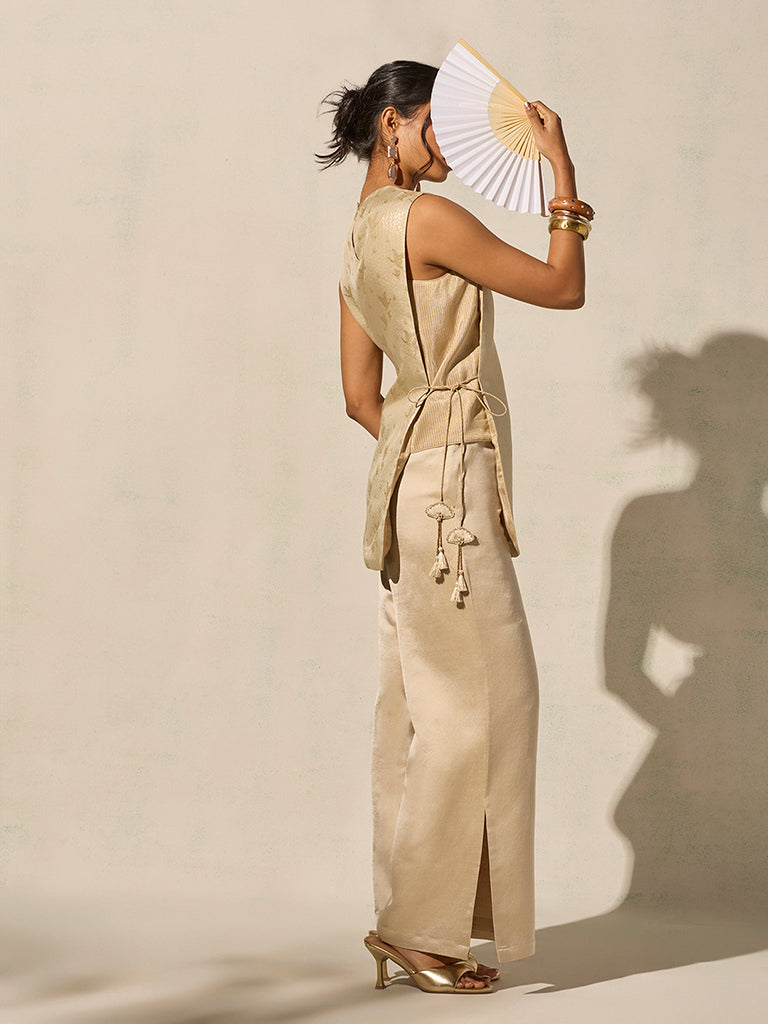 For celebrations that favour quiet sophistication over excess, this co-ord set offers a refined festive alternative. Crafted from a lustrous fabric, the sleeveless kurta features a delicate tonal motif, side slits, and adjustable tie-up detailing that adds fluidity and dimension. Paired with straight-fit pants designed with an elasticated waistband and practical side pockets, the set balances ease and elegance.