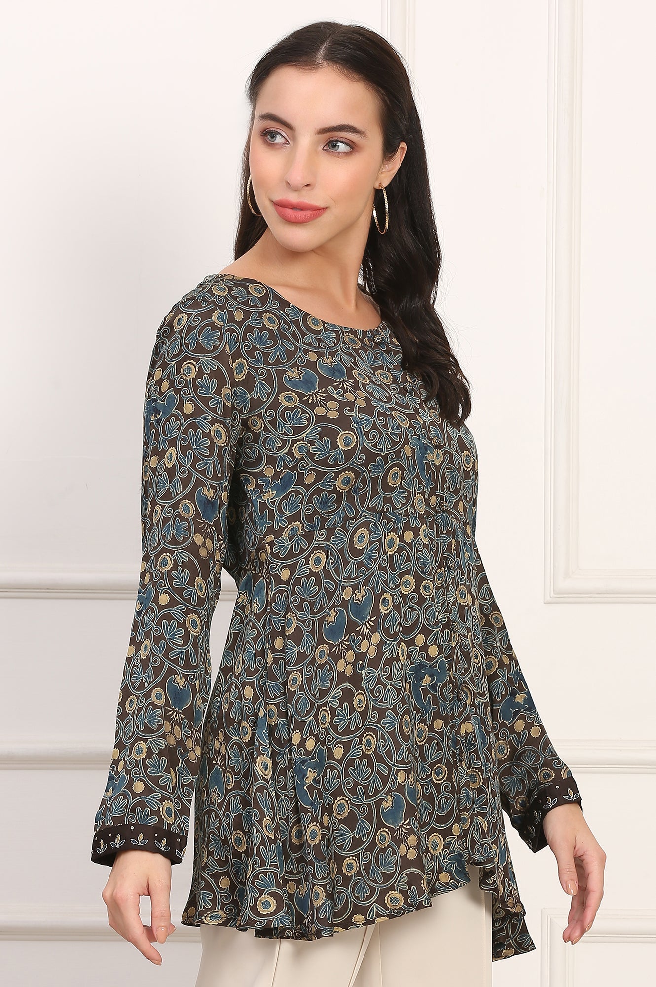 Grace your everyday ethnic wardrobe with this chocolate brown ajrak printed top for women from Folksong. Crafted in sumptuous 100% viscose modal satin, the top brings fluid movement and soft sheen to your casual ensembles. Featuring a timeless round neckline, full-length sleeves, and a straight silhouette, it flatters with ease and understated refinement. The surface is enhanced with delicate thread embroidery over an elegant floral print, giving it a distinct handcrafted appeal. Its mid-thigh length and no-slit design provide modesty with poise, while the button closure adds practicality. Lightweight and versatile, this woven brown ethnic top is a perfect companion for summer styling, pairing effortlessly with straight pants, ethnic skirts, or relaxed denim for an Indo-contemporary look.