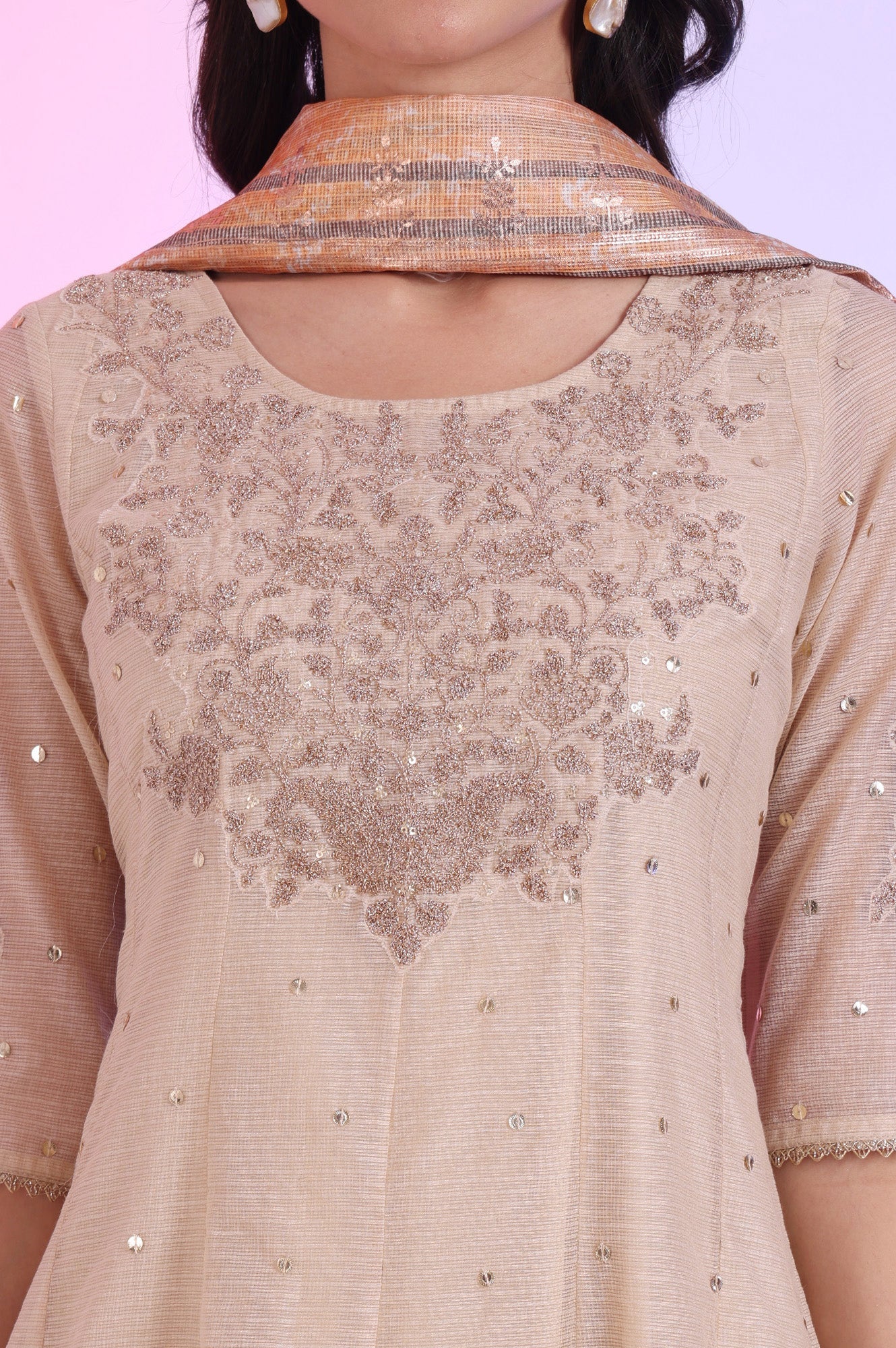 Elevate your special occasions with this exquisite ethnic set from Aurelia. Crafted from 100% polyester, this woven ensemble features a round neckline and three-quarter sleeves, perfect for a fusion look. The natural-colored set is adorned with intricate dori embroidery and foil detailing, adding a touch of glamour. The flared anarkali silhouette is complemented by trousers and a dupatta, creating a complete and elegant outfit. Hand-wash recommended to maintain its beauty. This women's ethnic set is designed to make you stand out at any special event with its unique blend of traditional and contemporary elements.