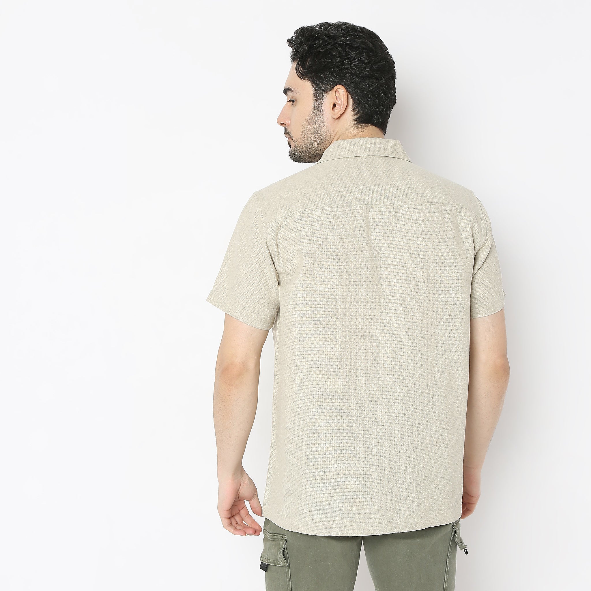 Experience the perfect blend of comfort and style with our Camp Collar Half Sleeve Shirt. Crafted from 100% cotton, this shirt offers a soft touch against your skin, ensuring you stay comfortable throughout the day. Its solid pattern and woven texture make it a versatile addition to any wardrobe, suitable for both casual outings and semi-formal occasions.