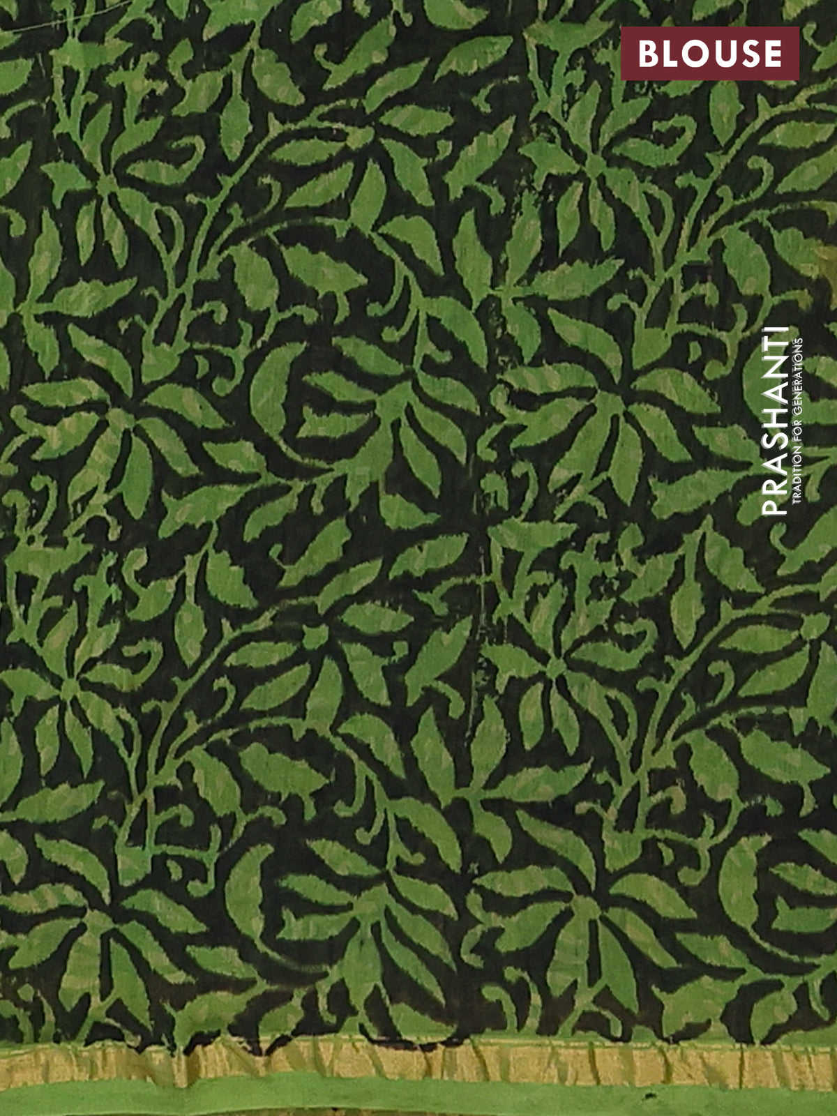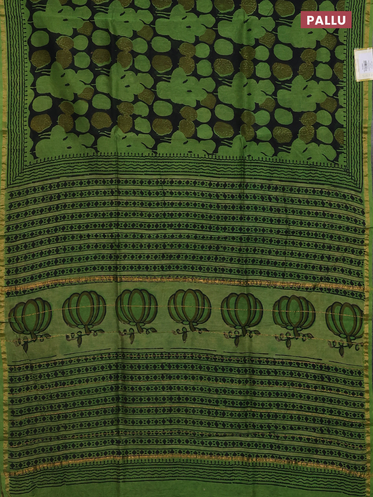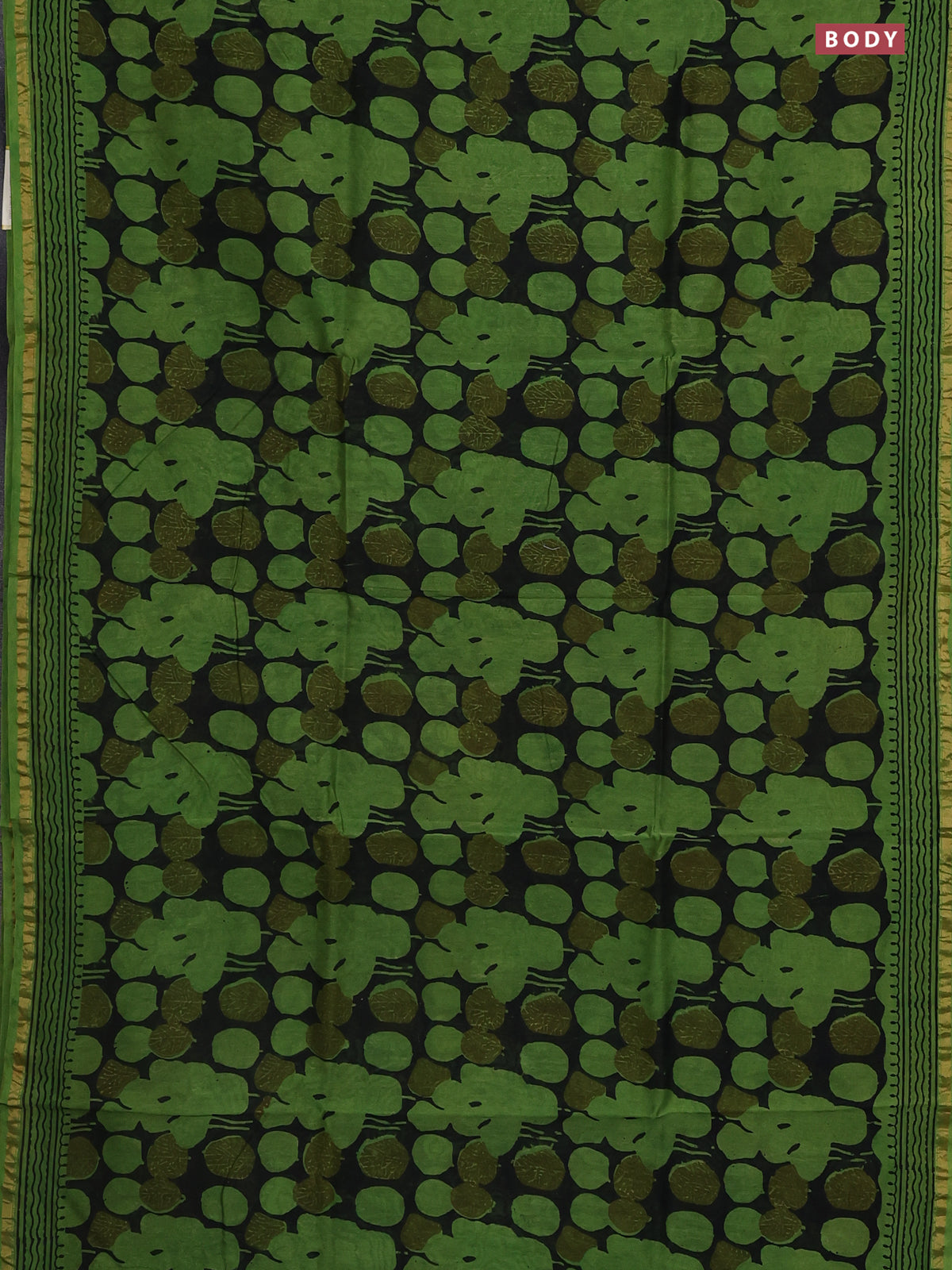 Chanderi bagru saree black and green with allover prints and small zari woven border