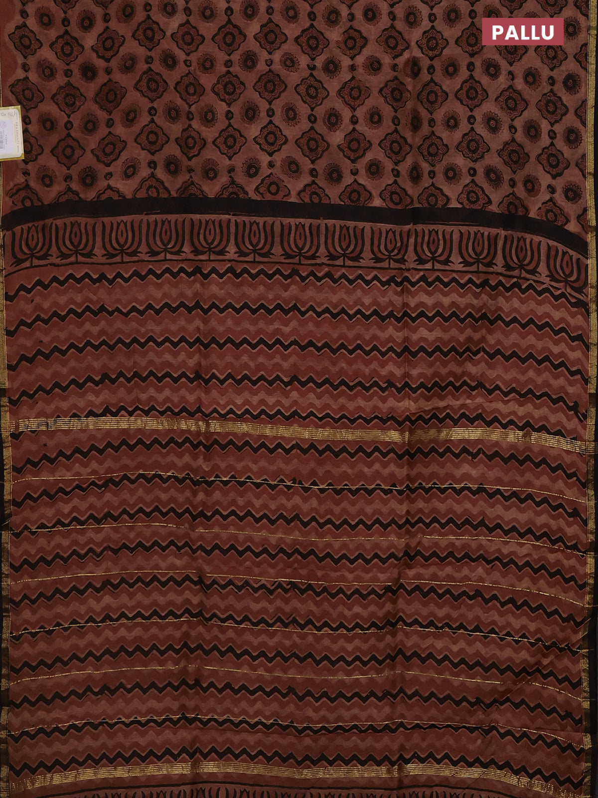 Chanderi bagru saree pastel brown and black with allover ajrakh prints and small zari woven border
