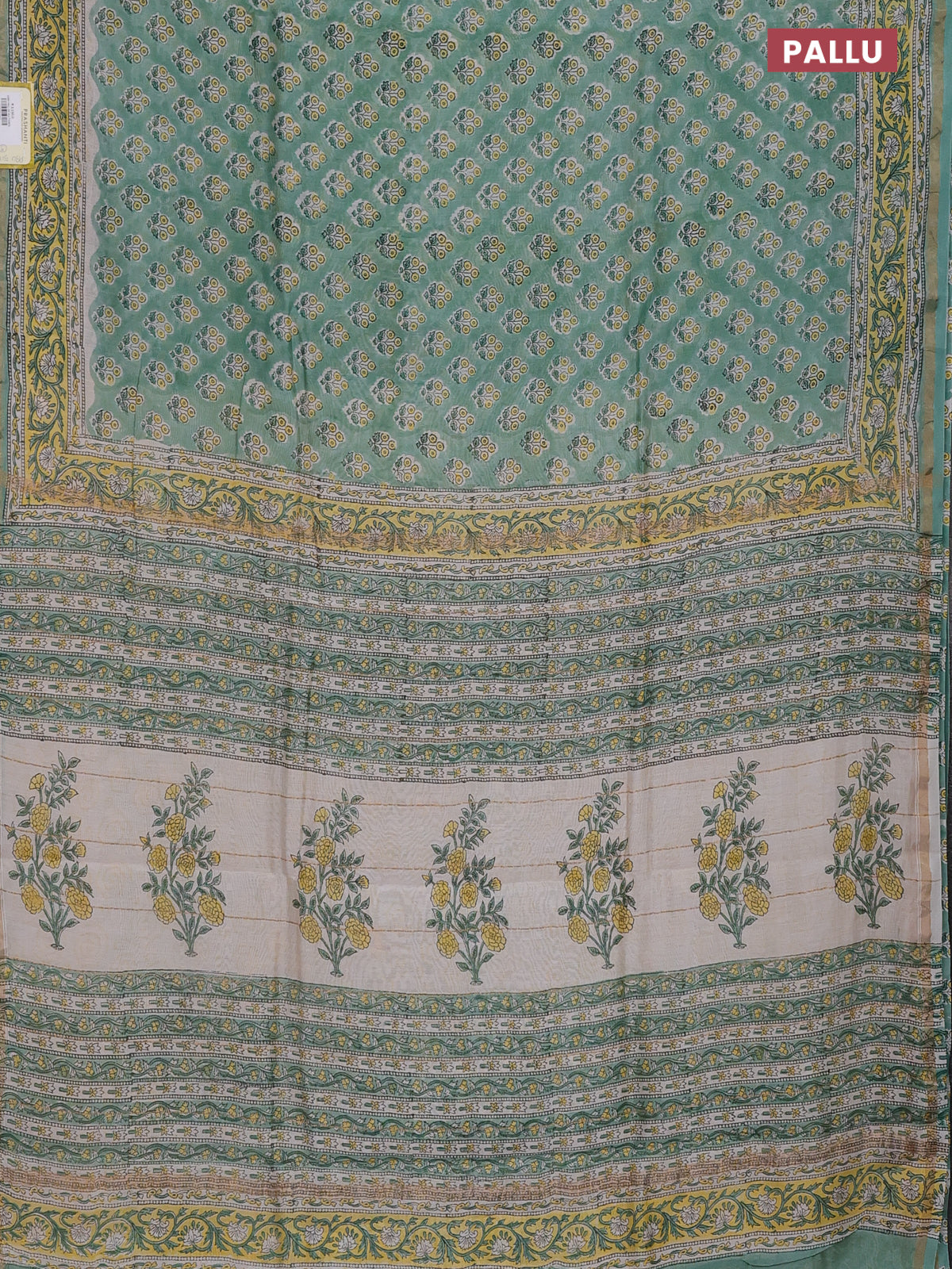 Chanderi bagru saree pastel green with allover floral butta prints and small zari woven border