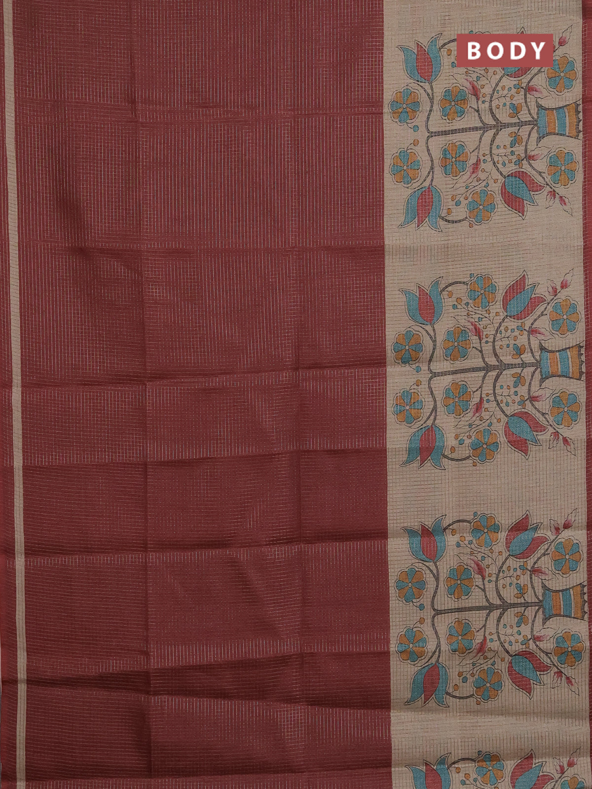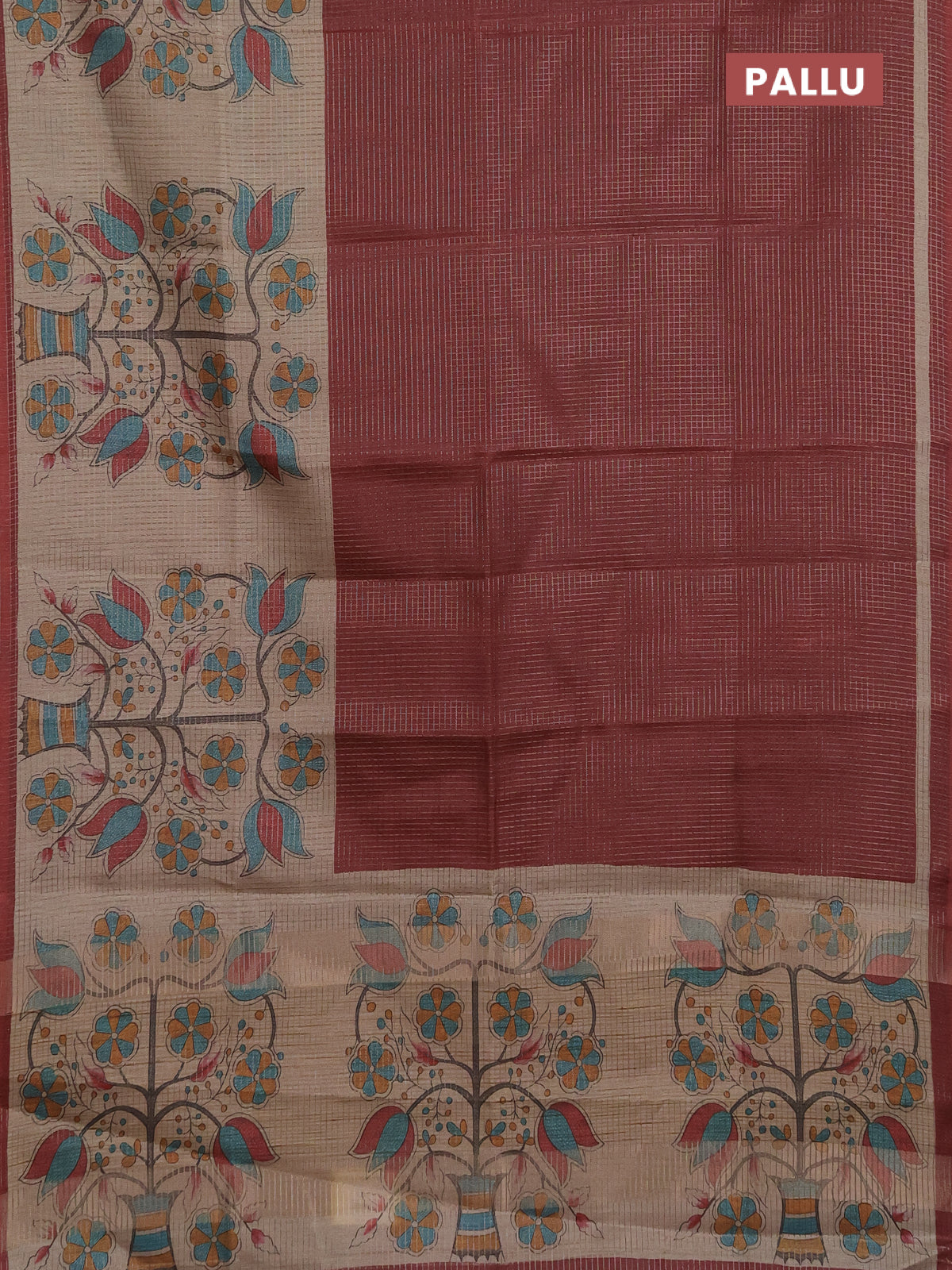 Chappa saree deep maroon and beige with allover small zari checked pattern and floral digital printed pallu