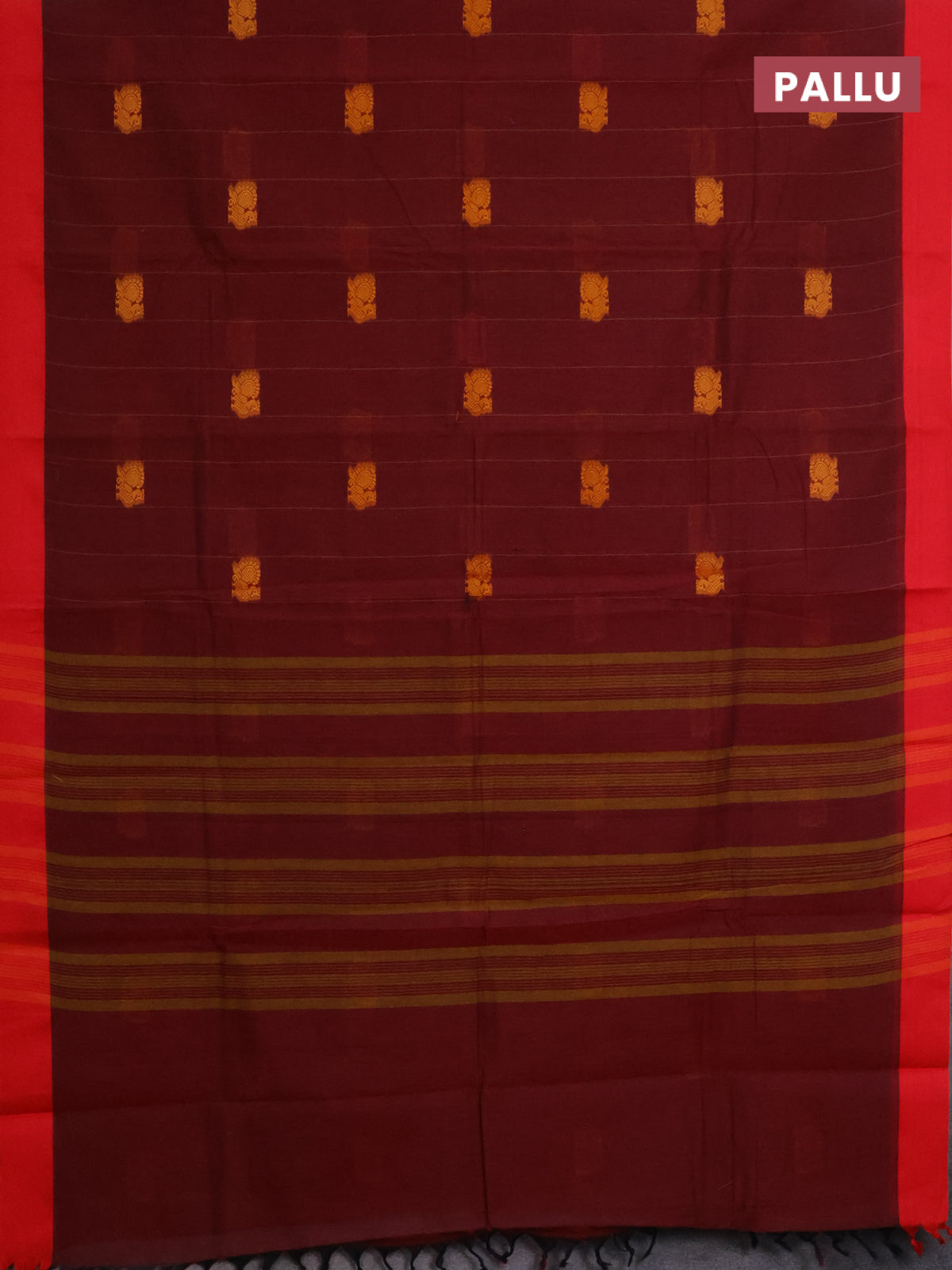 Chettinad cotton saree deep maroon and red with allover stripe pattern & thread woven buttas and simple border
