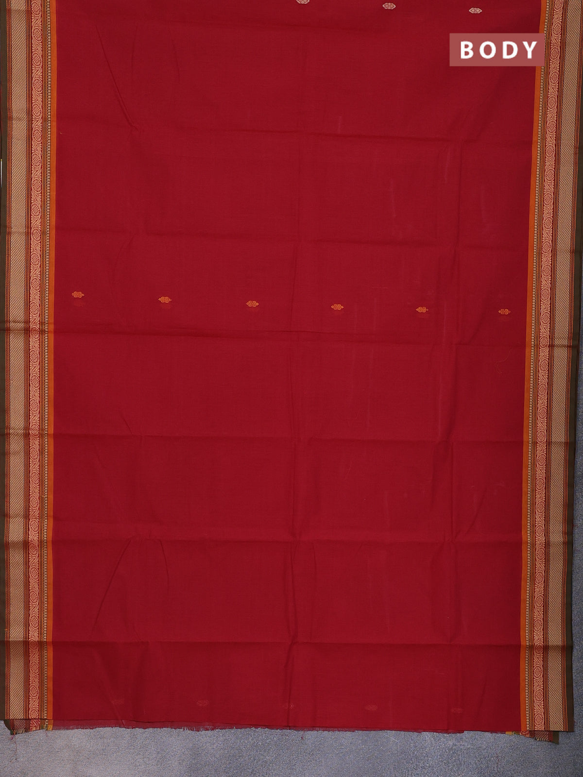 Chettinad cotton saree kumkum red and sap green with thread woven buttas and thread woven border