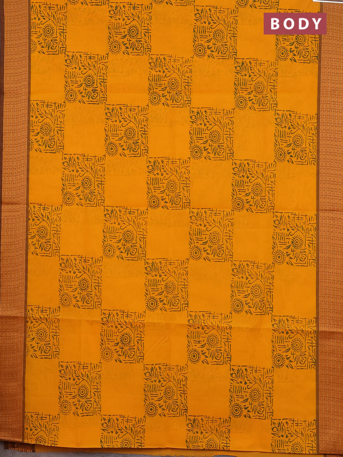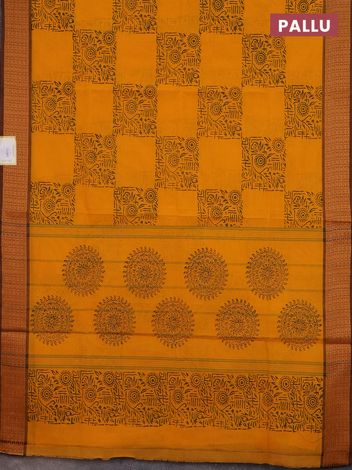 Chettinad cotton saree mango yellow and brown with allover block prints and thread woven border