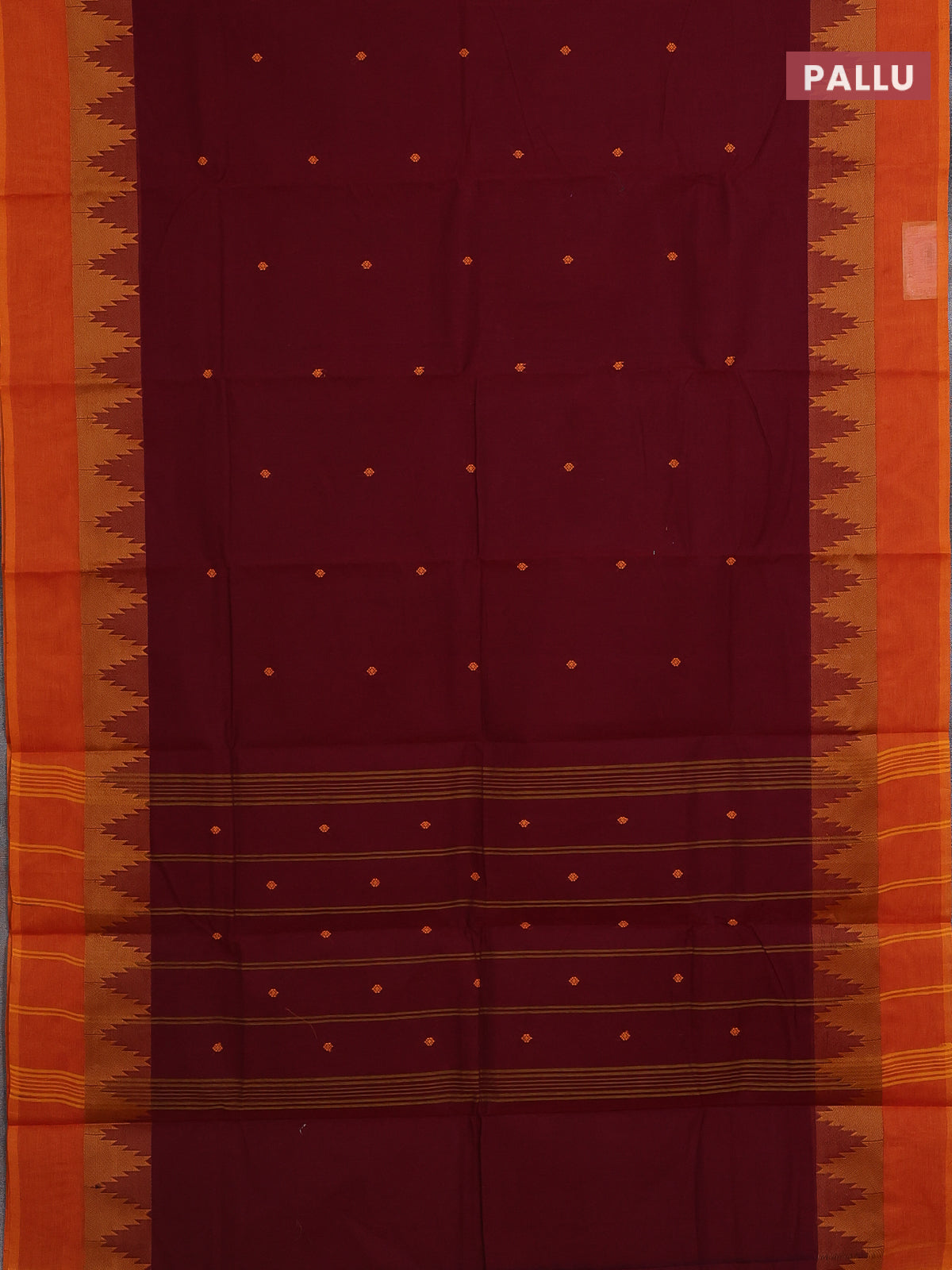 Chettinad cotton saree maroon and sunset orange with thread woven buttas and temple design simple border
