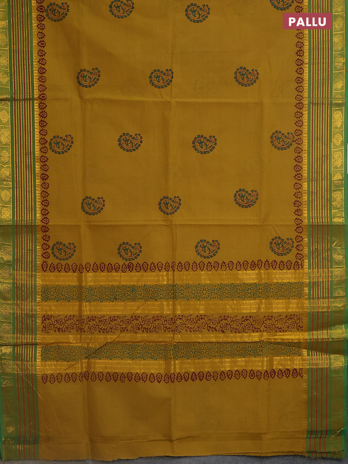 Chettinad cotton saree mustard green and green with butta prints and zari woven border