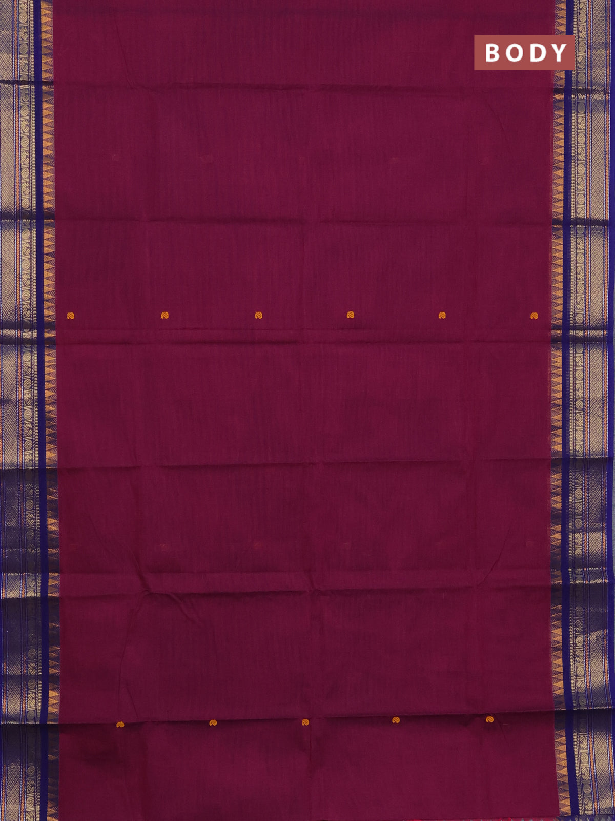 Chettinad cotton saree wine shade and dark voilet with thread woven buttas and temple disign zari woven border