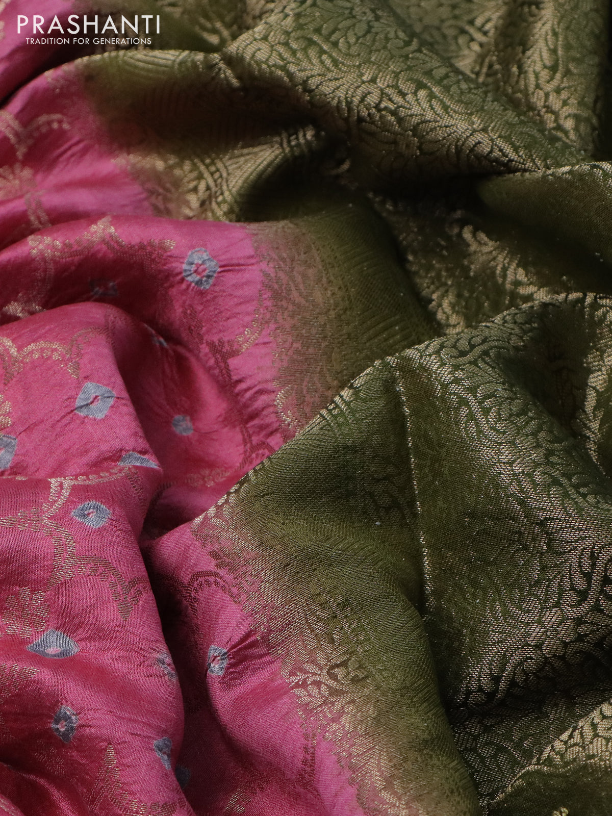 Chiniya silk saree peach pink and mehendi green with allover zari weaves & bandhini prints and zari woven border