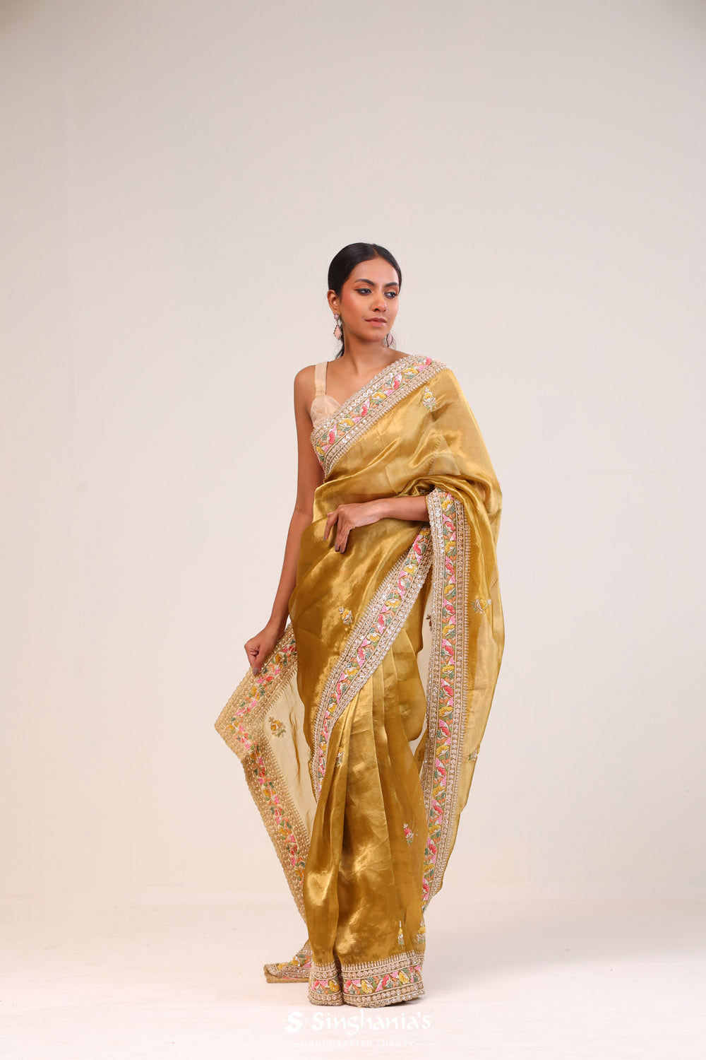 This alluring tissue saree in cream gold has floral butti embroidery all over the body with intricately embroidered small, colourful floral border in sequins and threadwork. It's a great choice for dressing up for a wedding or even for a festive occasion.