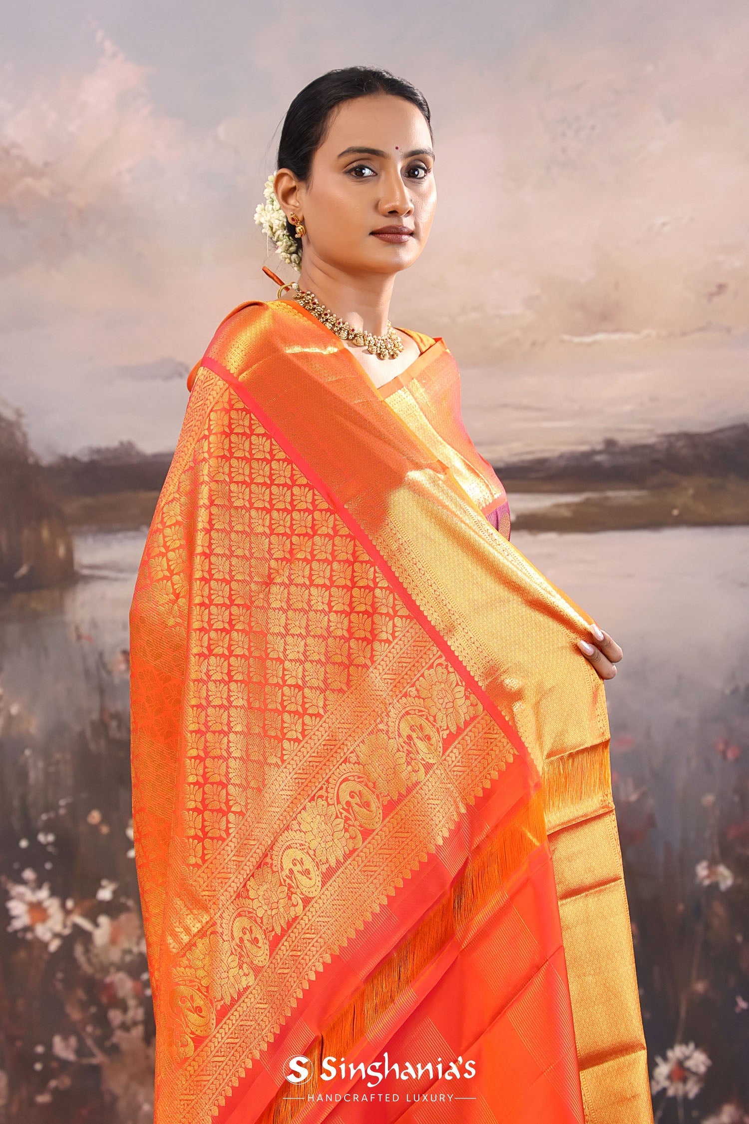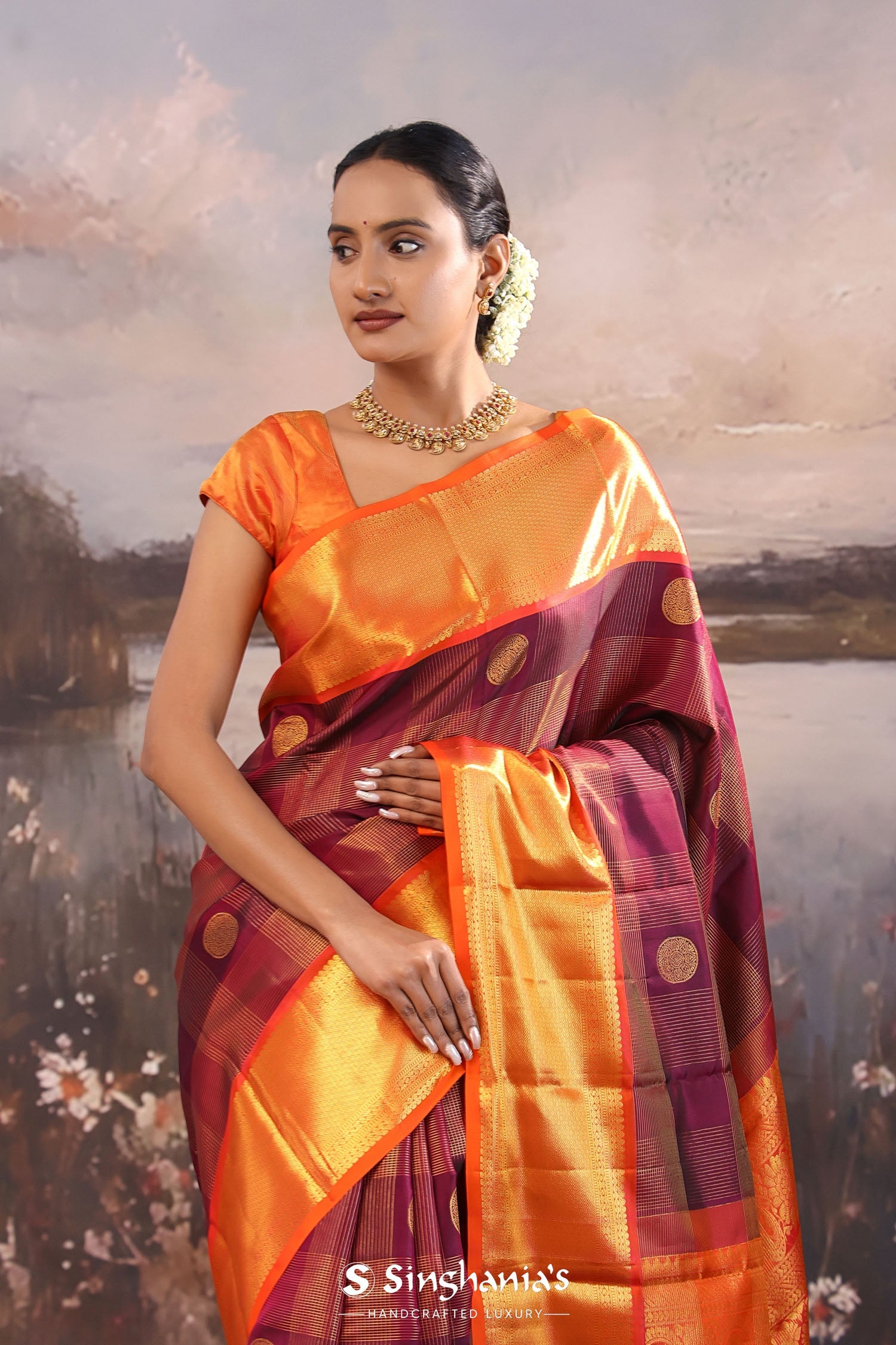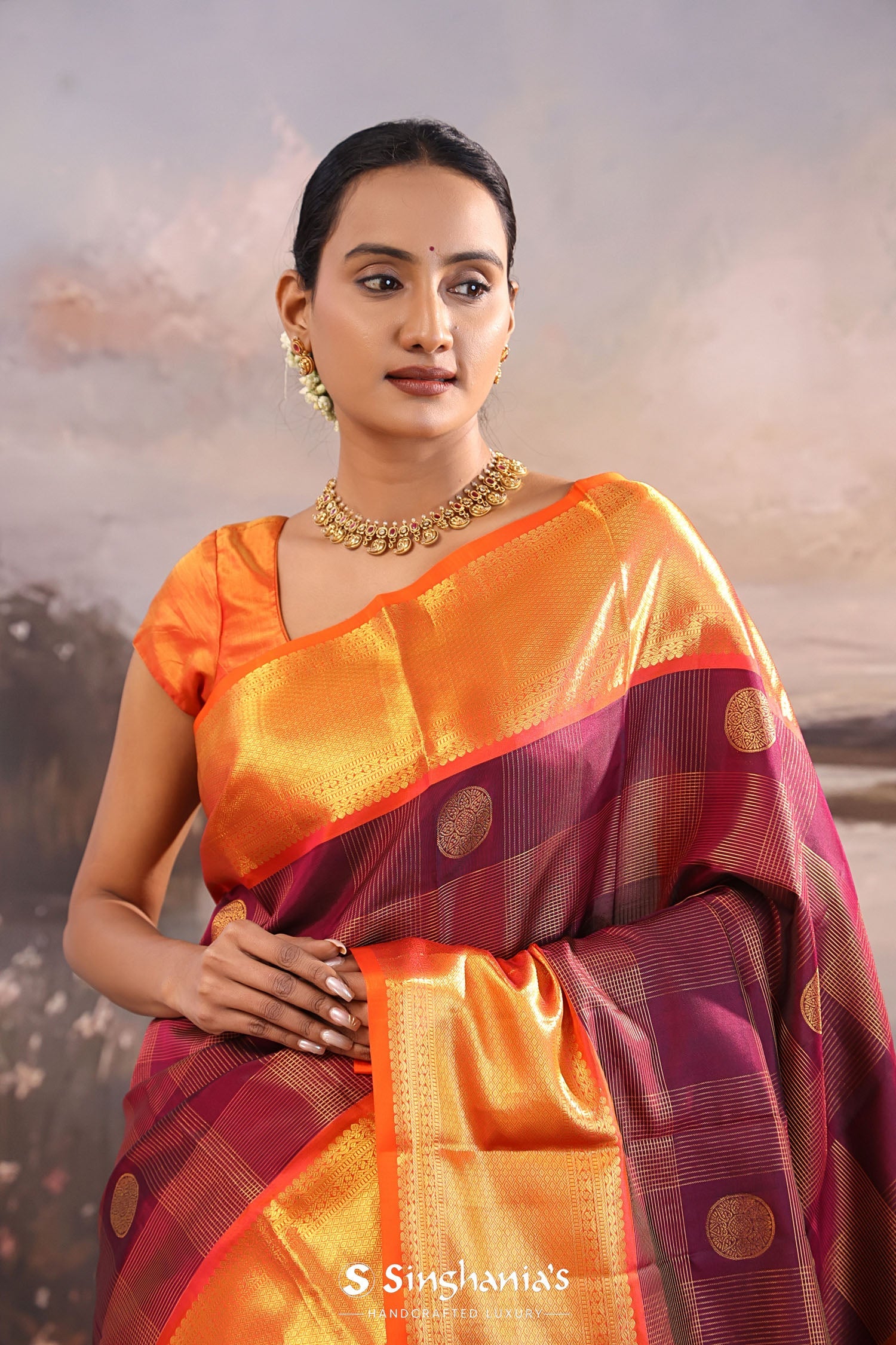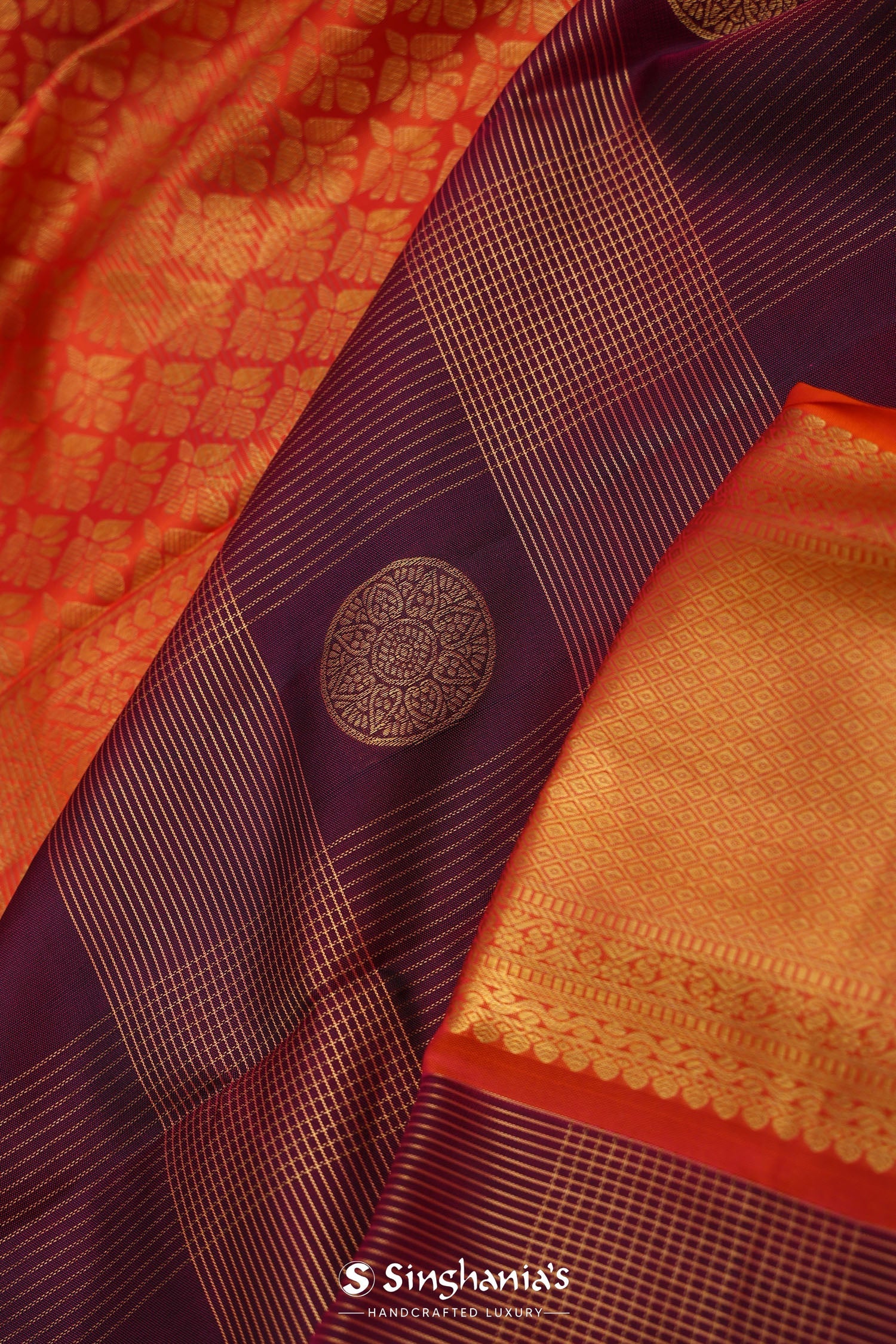 The checks pattern and rudraksha motifs woven with gold zari on the body of dark maroon kanjivaram silk saree complemented with contrast orange border