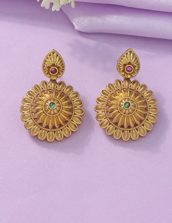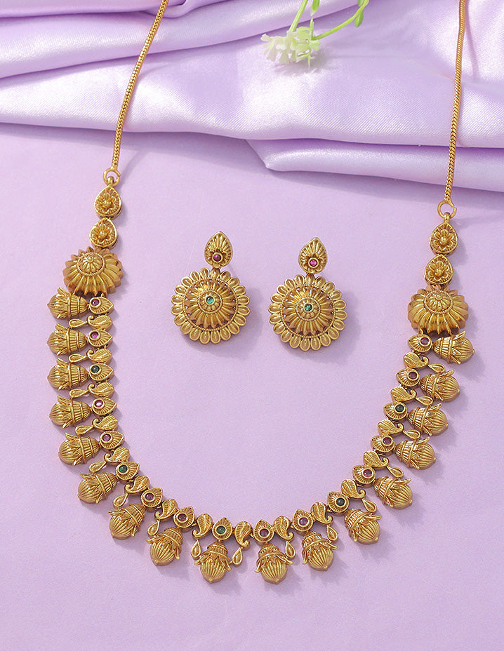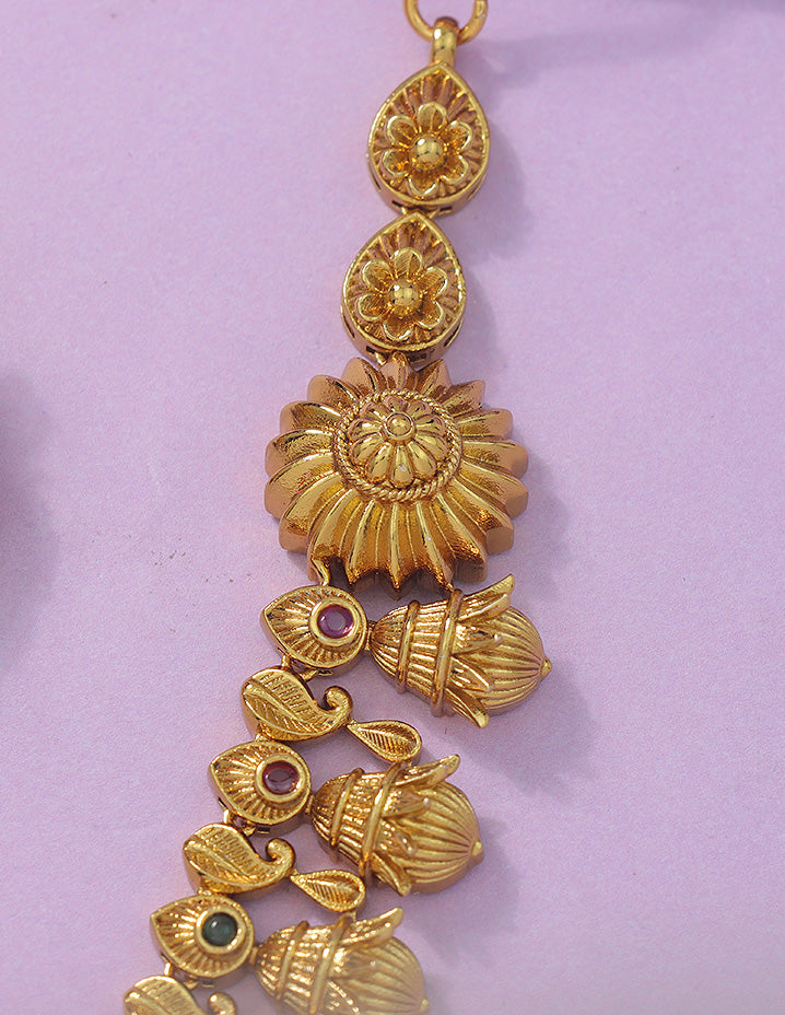 This Matt Polish Kempu Necklace Set, studded with dazzling ruby and emerald stones, radiates elegance and style. Its unique design is a visual treat, making it the perfect statement piece for any occasion.