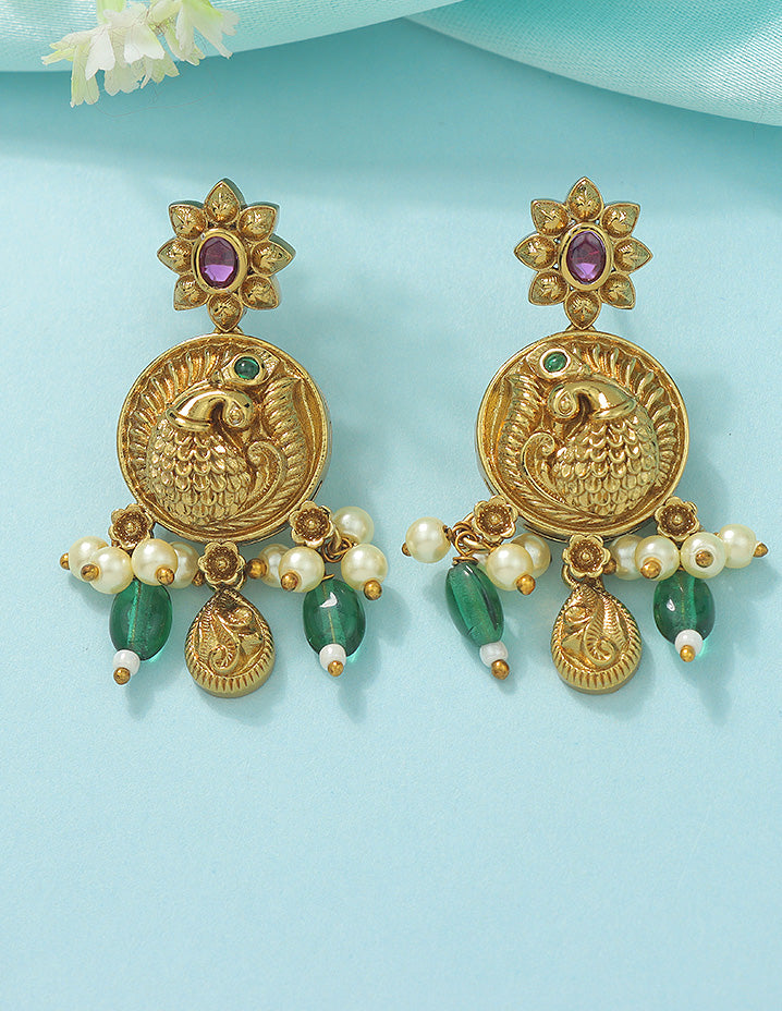 This Matt Polish Kempu Necklace Set, studded with dazzling ruby and emerald stones, radiates elegance and style. Its unique design is a visual treat, making it the perfect statement piece for any occasion.