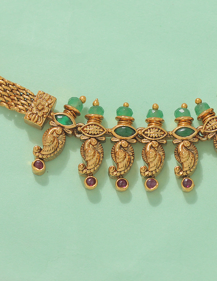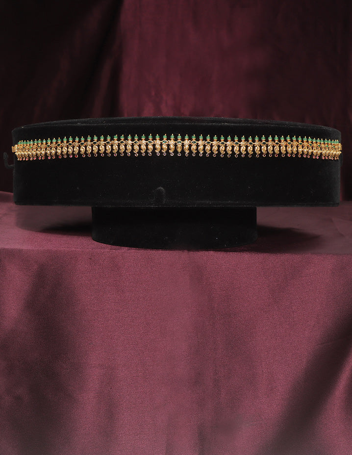 Delicately designed with Kempu stones, this chic and ethnic chain Vaddanam adds a touch of elegance to any outfit. Perfectly pairs with a variety of styles, unleash your creativity with this hip belt.