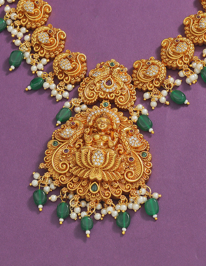 The Designer Lakshmi Devi Necklace Set features beautiful green beads and a detailed peacock design. This elegant set adds a traditional touch to any outfit, perfect for special occasions.