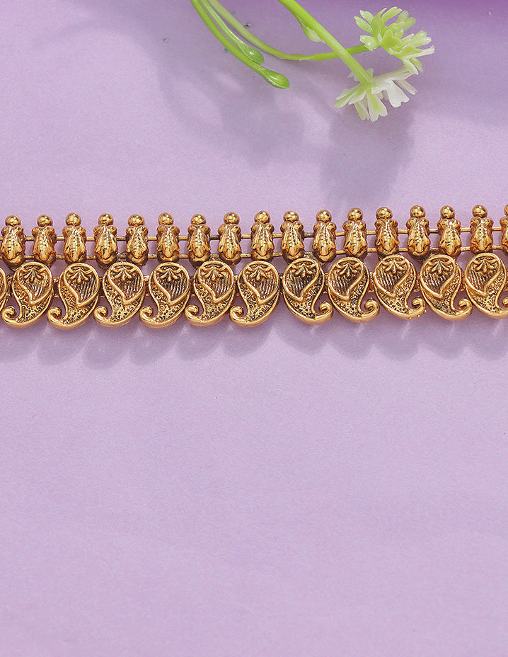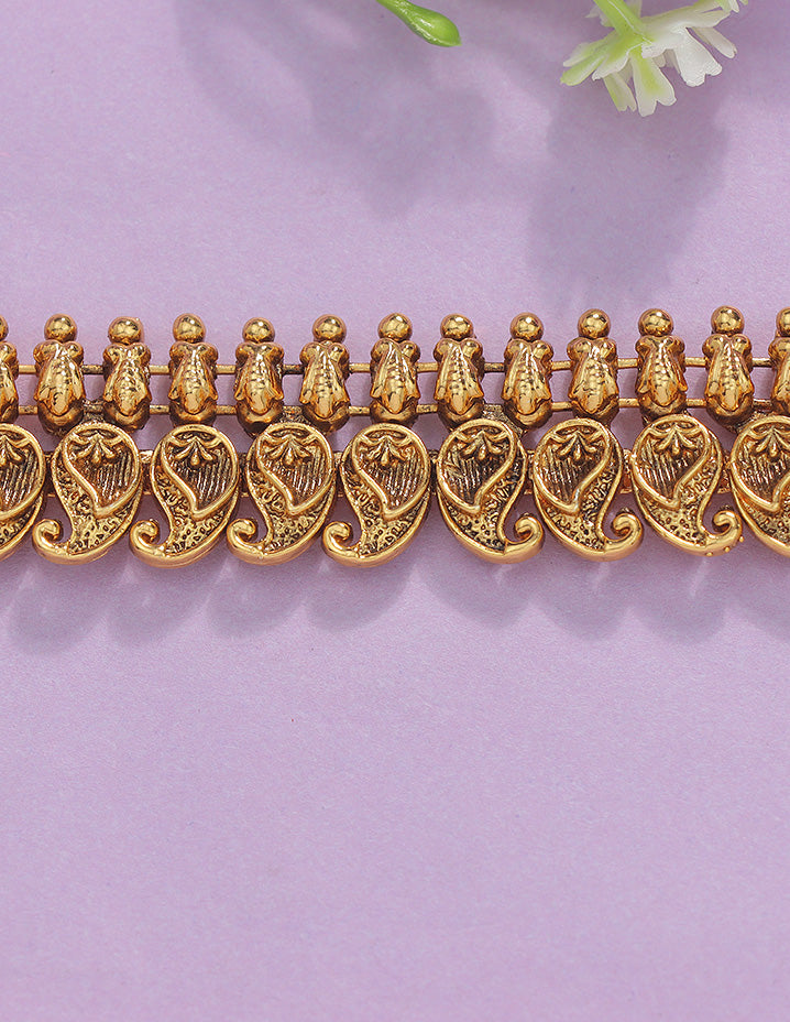 The Designer Mango Shape Chain Vaddanam appeals to customers seeking traditional elegance with a modern touch. It offers a unique mango-shaped design that enhances ethnic attire with sophistication and craftsmanship.