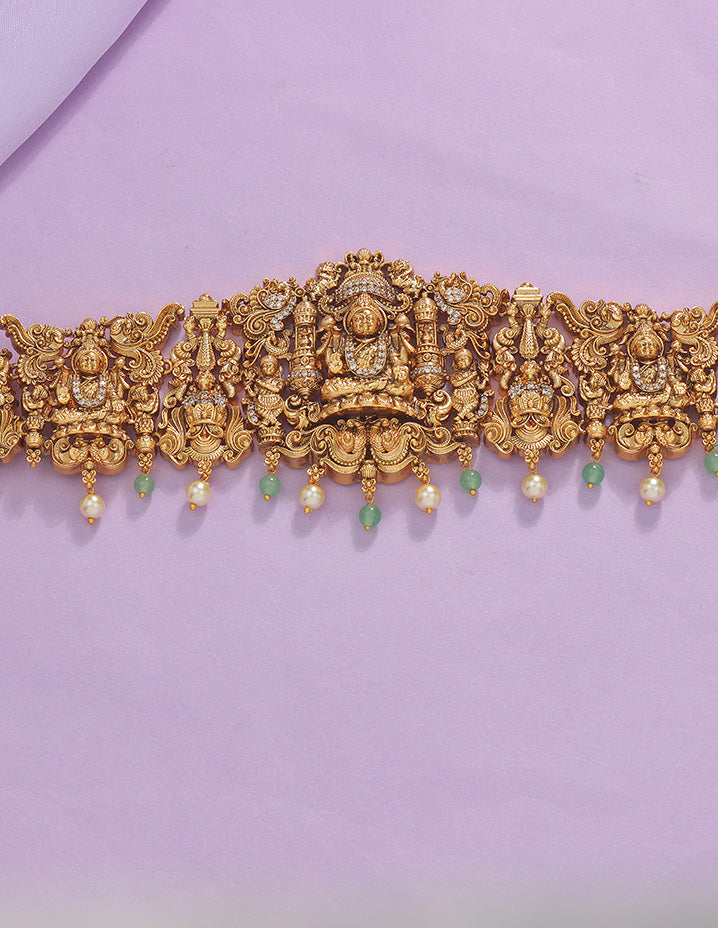 The Designer Matt Lakshmi Devi Chain Vaddanam appeals to customers who value intricate zirconia detailing and traditional elegance. It meets the demand for ornate, culturally significant jewelry with a modern designer finish.