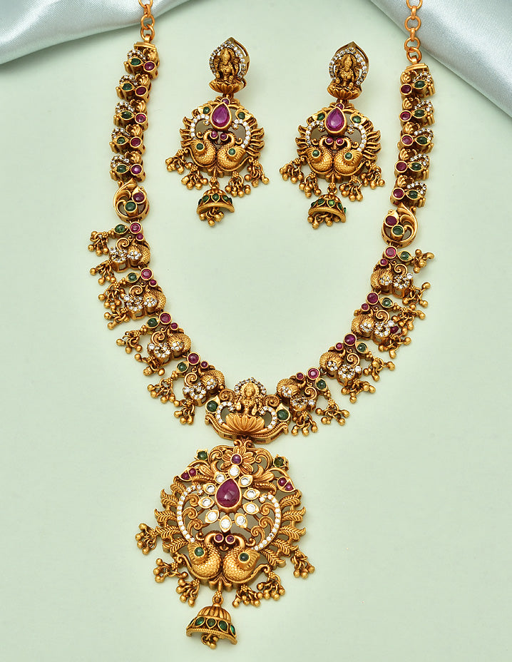 The Designer Matt Zirconia Necklace Set features a stunning peacock design, adorned with exquisite Ruby, Emerald, and white stones of Lakshmi Devi. Expertly crafted, this set is sure to elevate any outfit and make a bold statement. Experience luxury and elegance with this one-of-a-kind necklace set.