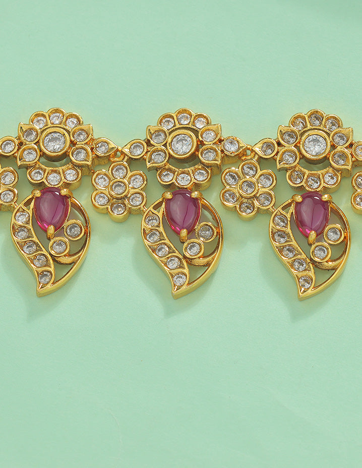 This Designer Zirconia Mango Shape Chain Vaddanam features ruby and white tones with a sophisticated gold matt polish, appealing to customers who value elegant and timeless ethnic jewelry. It is crafted for those seeking exquisite detail and lasting comfort in their traditional accessories.