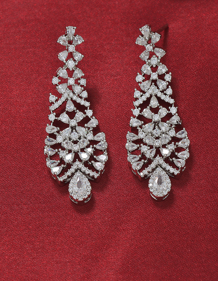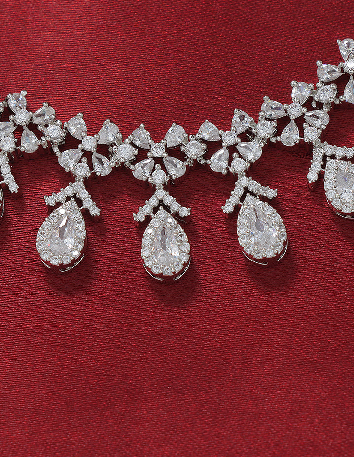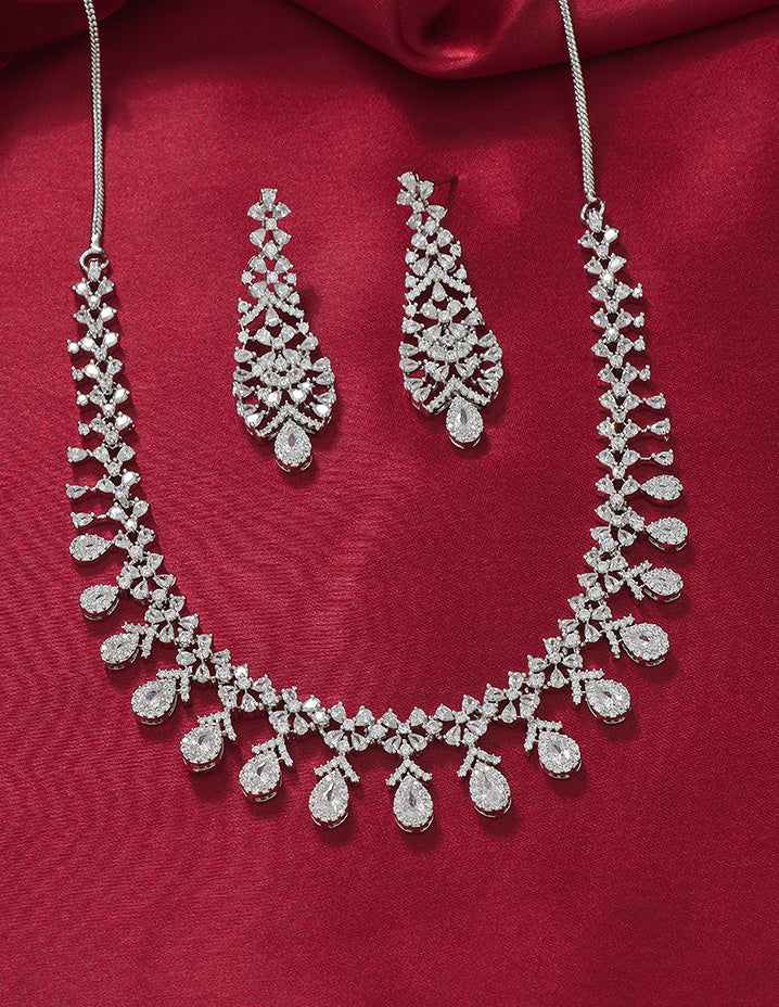 This Designer Zirconia Elegance Necklace Set features sparkling white stones enhanced by a durable rhodium polish. Its refined craftsmanship adds a sophisticated glow to any ensemble.
