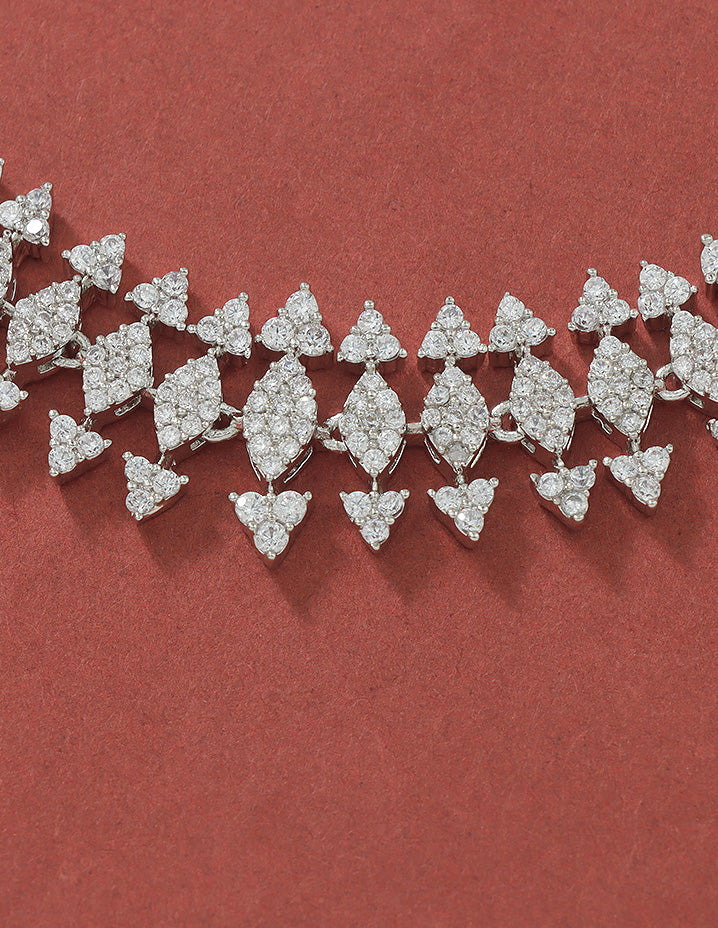 This Designer Zirconia Crystal Elegance Necklace Set features two exquisite lines of sparkling white zirconia stones, all delicately set in lustrous white rhodium. Its refined design delivers timeless sophistication, perfectly enhancing any formal or festive attire with subtle brilliance and expert craftsmanship.