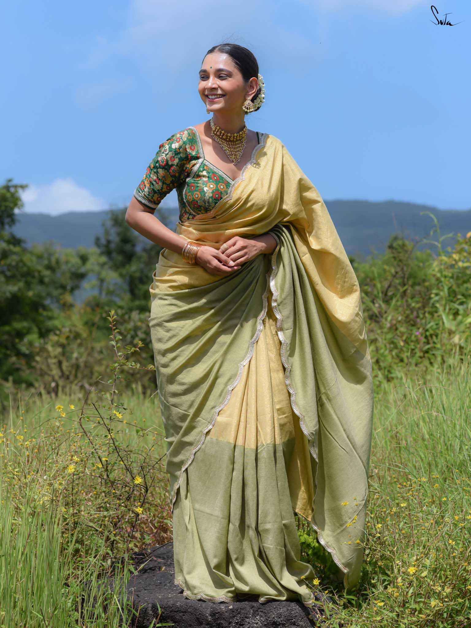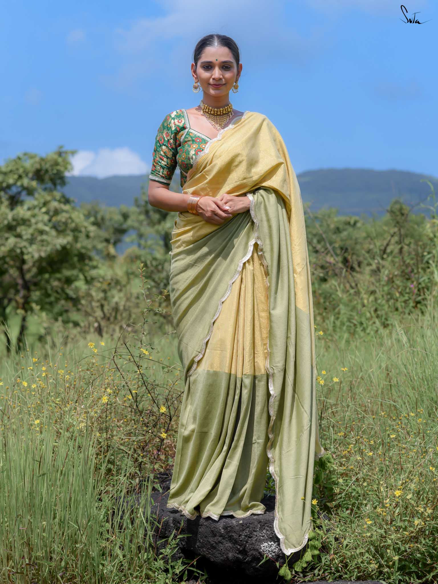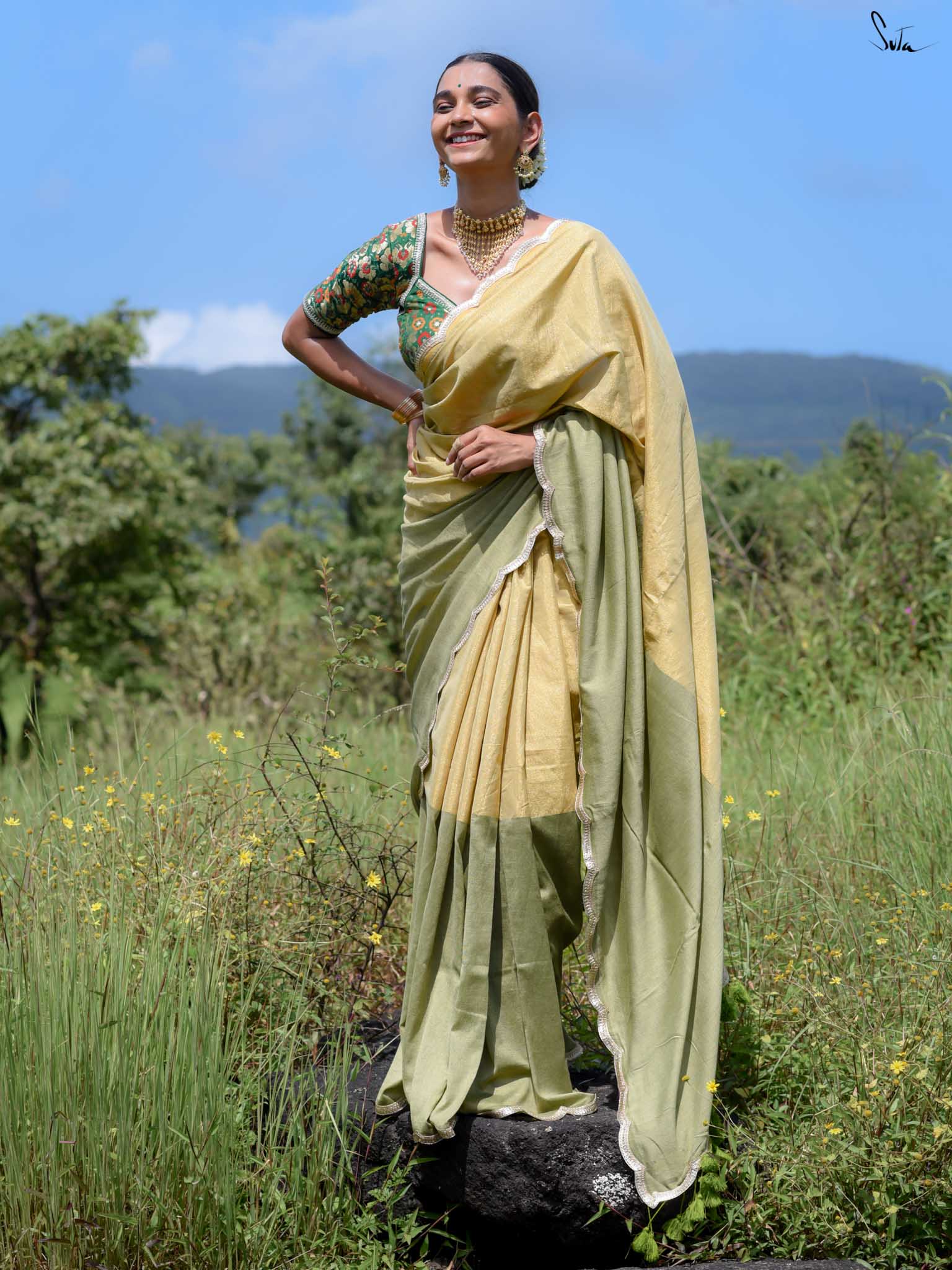 Soft, luminous, and full of grace, Dipped in Pistachio brings a refreshing twist to festive elegance. This cotton-acrylic saree features a beautiful half-and-half interplay of light green and gold zari, finished with a delicate gold scallop lace that adds a touch of regal charm. Woven with care, it’s the perfect drape for celebrations, weddings, or any moment that calls for subtle opulence.