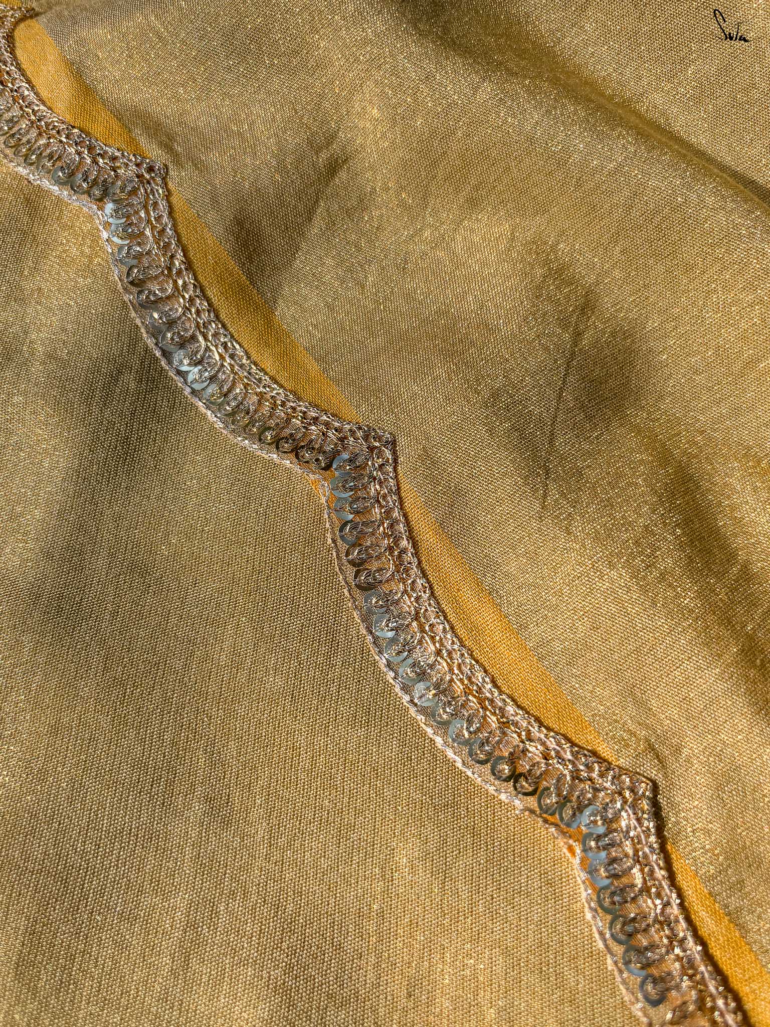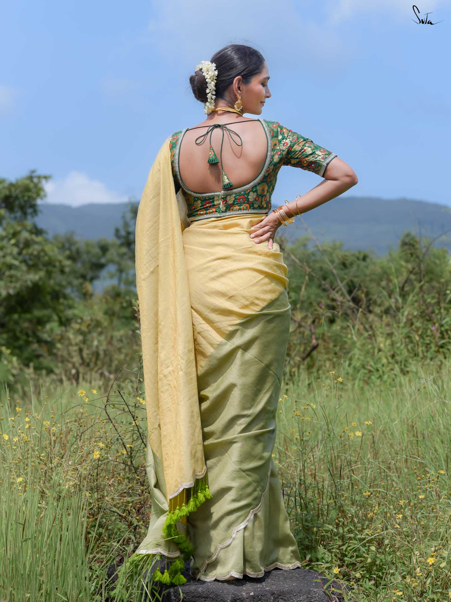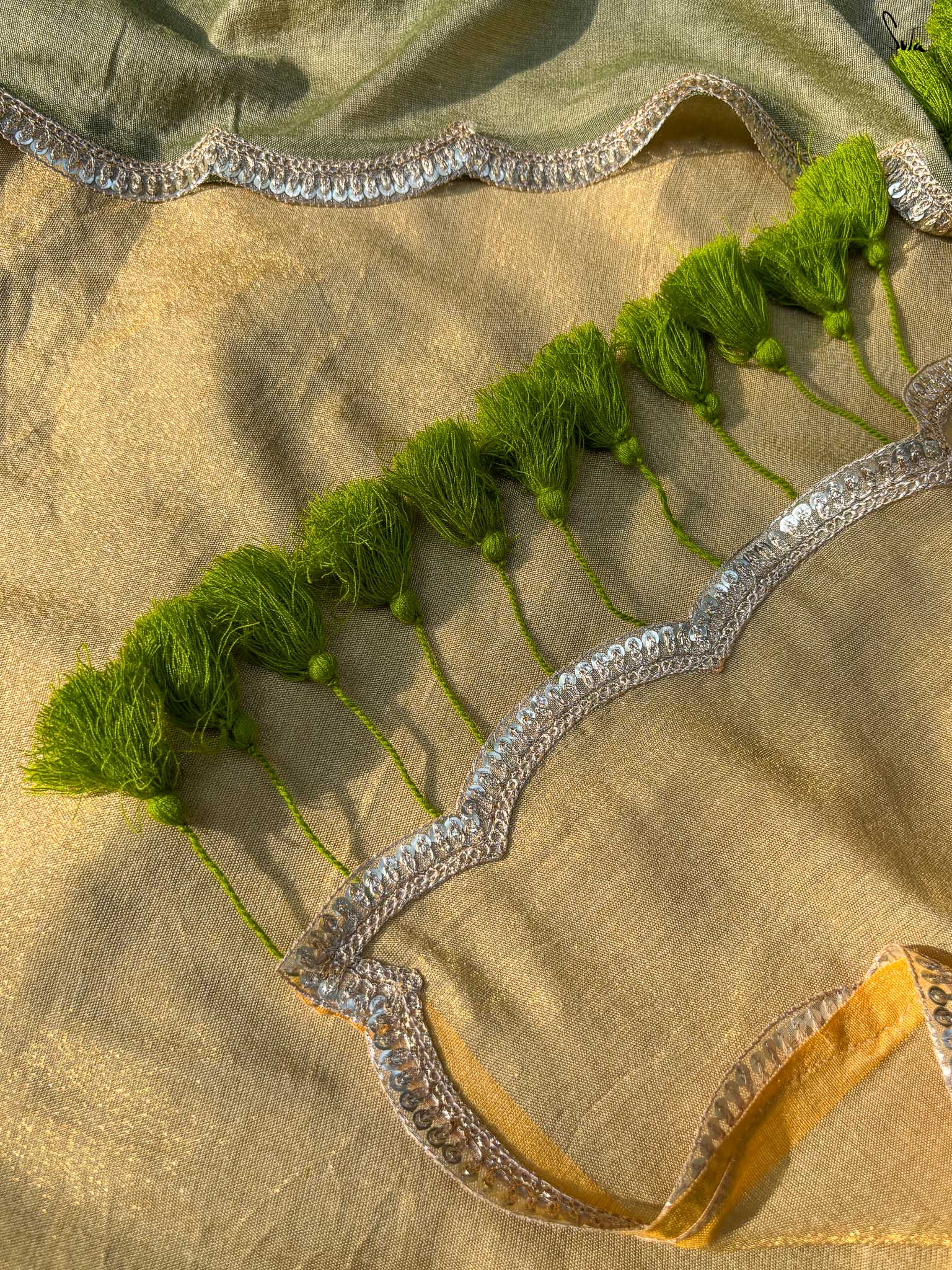 Soft, luminous, and full of grace, Dipped in Pistachio brings a refreshing twist to festive elegance. This cotton-acrylic saree features a beautiful half-and-half interplay of light green and gold zari, finished with a delicate gold scallop lace that adds a touch of regal charm. Woven with care, it’s the perfect drape for celebrations, weddings, or any moment that calls for subtle opulence.