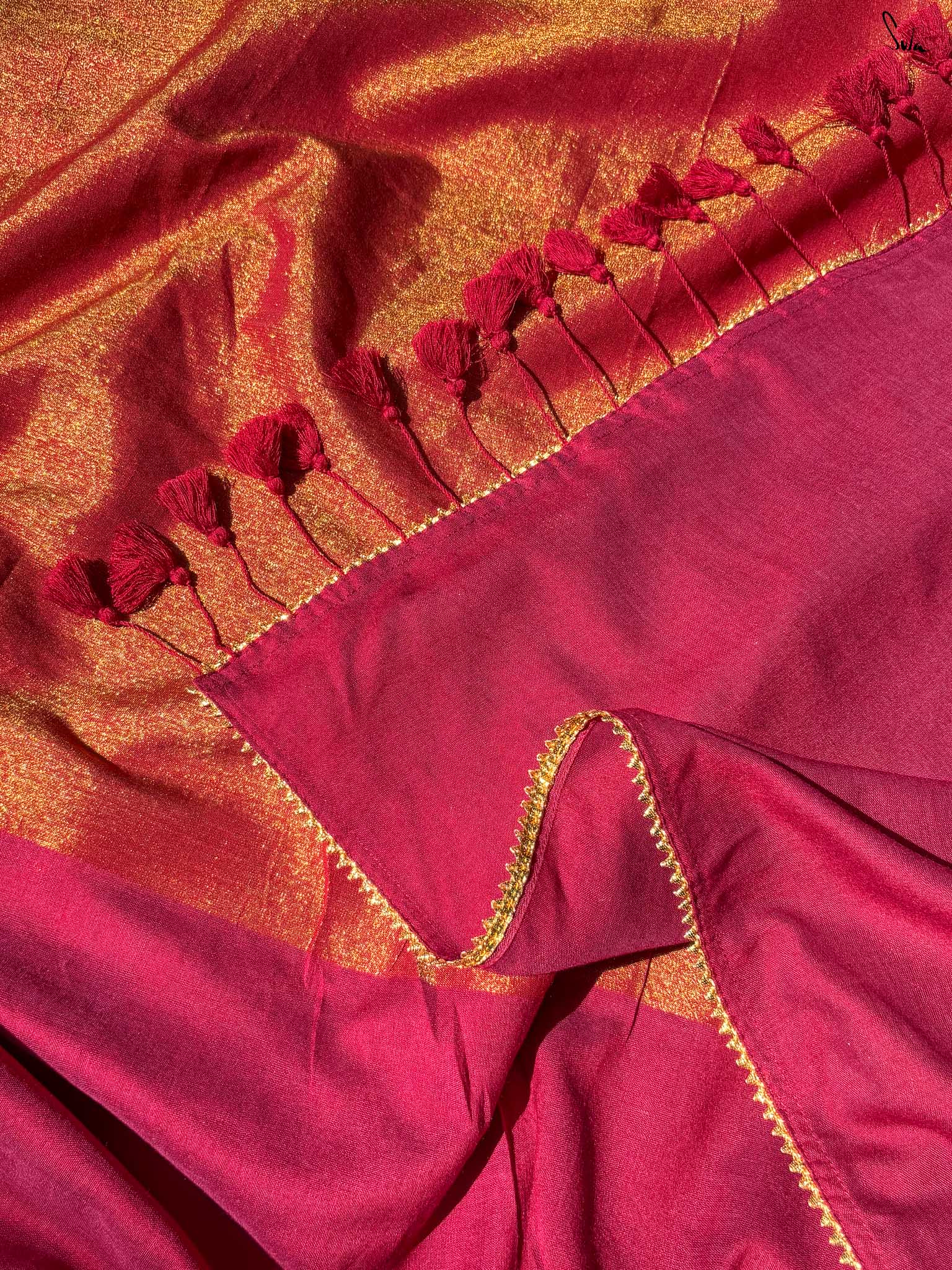 Rich, regal, and effortlessly graceful Dipped in Wine is where tradition meets timeless allure. This cotton-acrylic saree features a stunning half-and-half design of deep maroon and gleaming gold zari, finished with elegant Gota patti and Samosa lace along the borders. Every weave reflects festive grandeur, making it the perfect choice for weddings, celebrations, and special evenings that call for a touch of gold and glory.