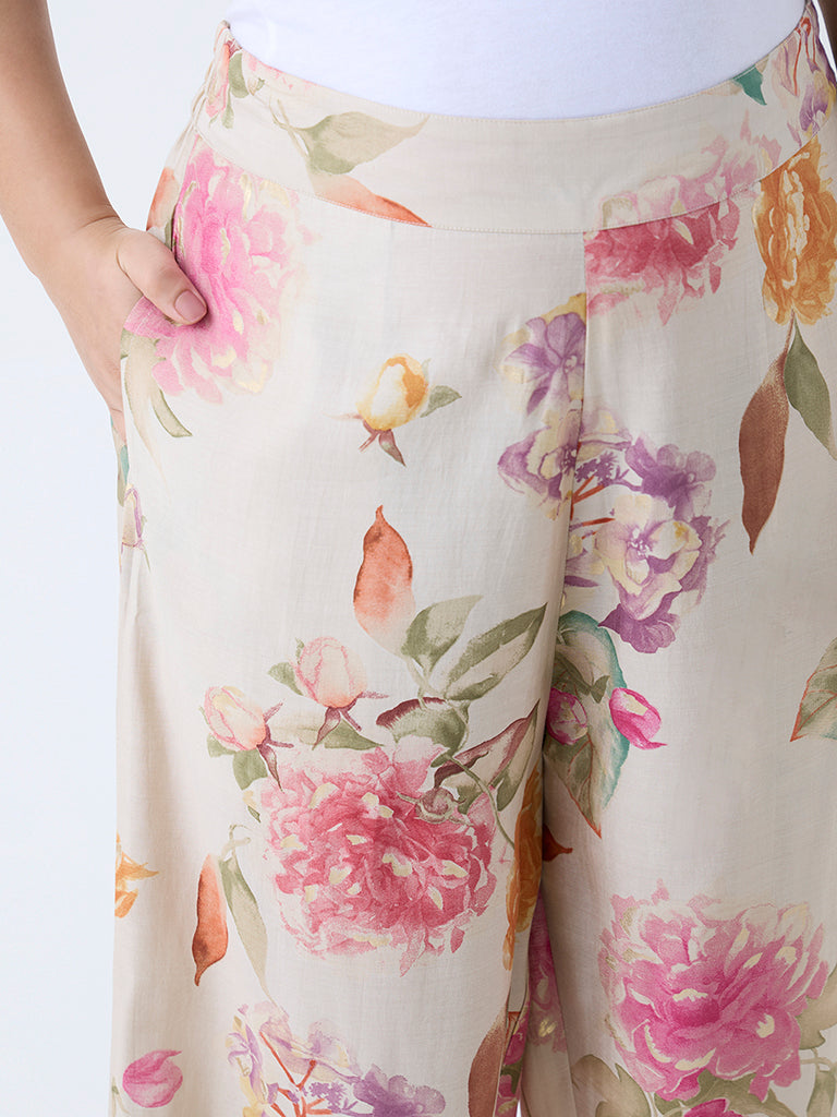 These beige ethnic pants from Diza are detailed with floral motifs for feminine charm. Tailored from a breathable fabric, they offer lasting comfort through the day. The elasticated waistband with adjustable drawstrings ensures ease of wear, while side pockets add a functional finish.