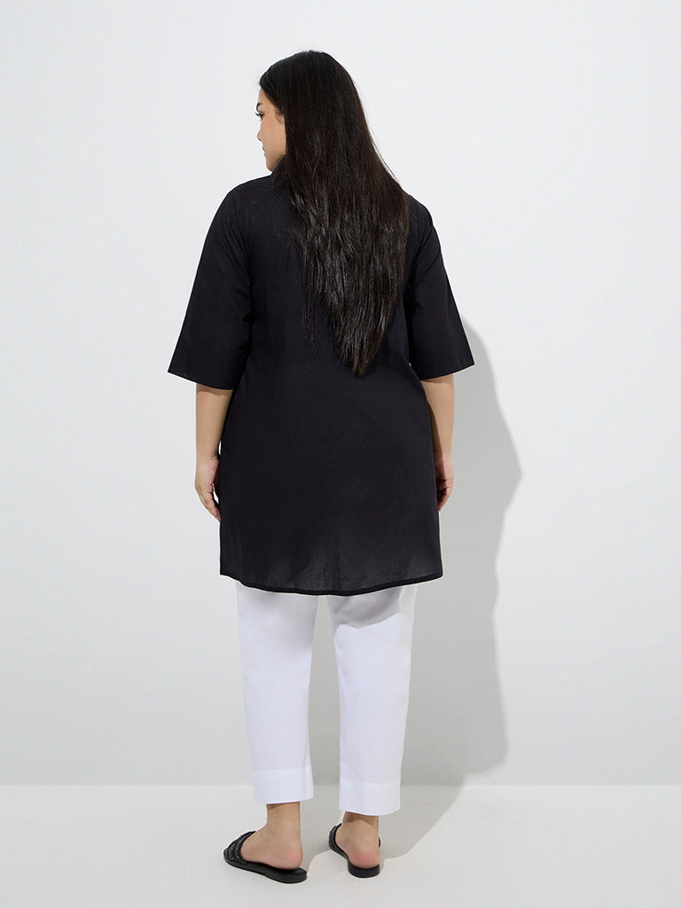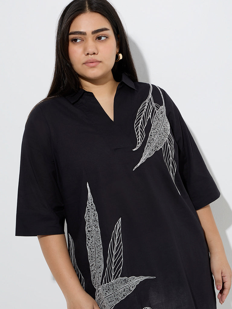 Diza presents this black Kurti, crafted from a cotton-rich fabric that promises effortless comfort. Adorned with exquisite leaf embroidery, it elevates ethnic wear with a refined touch. Designed with a sleek collar and elbow sleeves, this piece blends polished style with breathable ease for versatile wear.