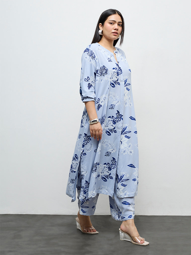 Diza presents this dusty blue botanical printed kurta crafted from premium fabric for breathable comfort through the day. Designed in a classic A-line silhouette, it is styled with a split neckline, a button placket and three-quarter sleeves. Practical side pockets enhance the design with everyday functionality.