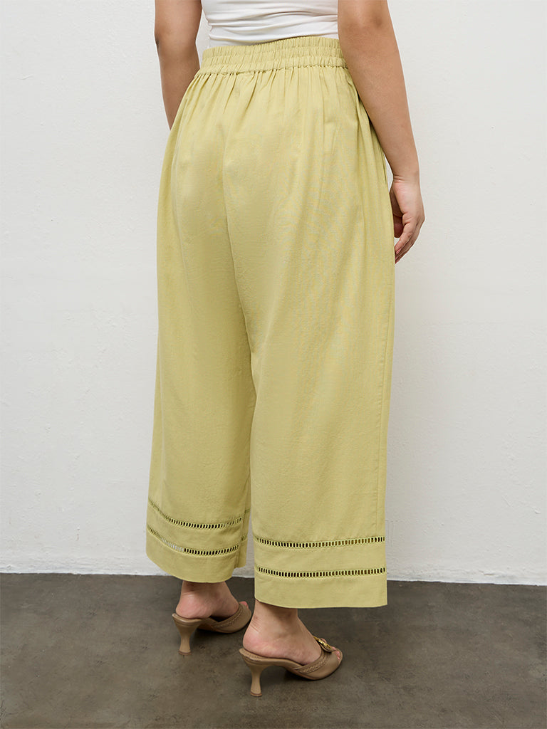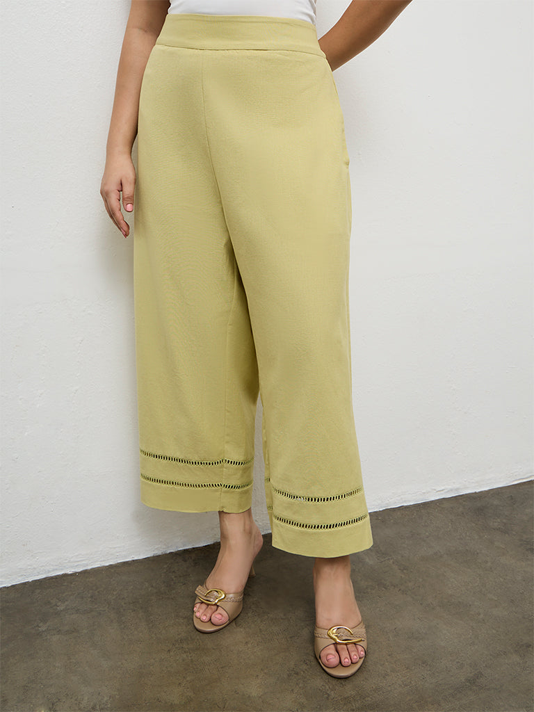 Refined simplicity defines these lime ethnic pants from Diza. Crafted from a soft, lightweight fabric, they deliver a fresh feel through the day. The elasticated waistline ensures a secure and dependable fit. Intricate cut-out embroidery above the hems lends a visual interest, enhancing the polished ethnic appeal.