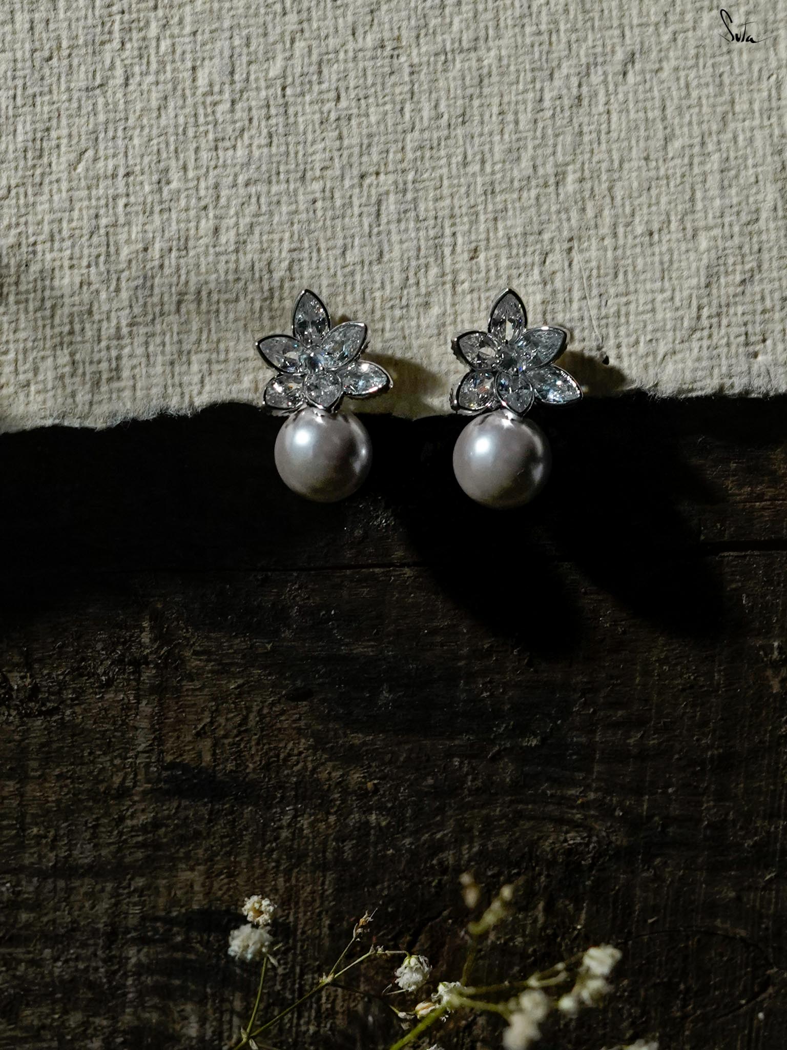 Crafted in 92.5 silver with a chrome finish, these screw-style earrings feature a delicate pearl and AD setting. Inspired by a quiet reminder of how the smallest things can mean the most, a dot that anchors your everyday. Wear it all day, every day.