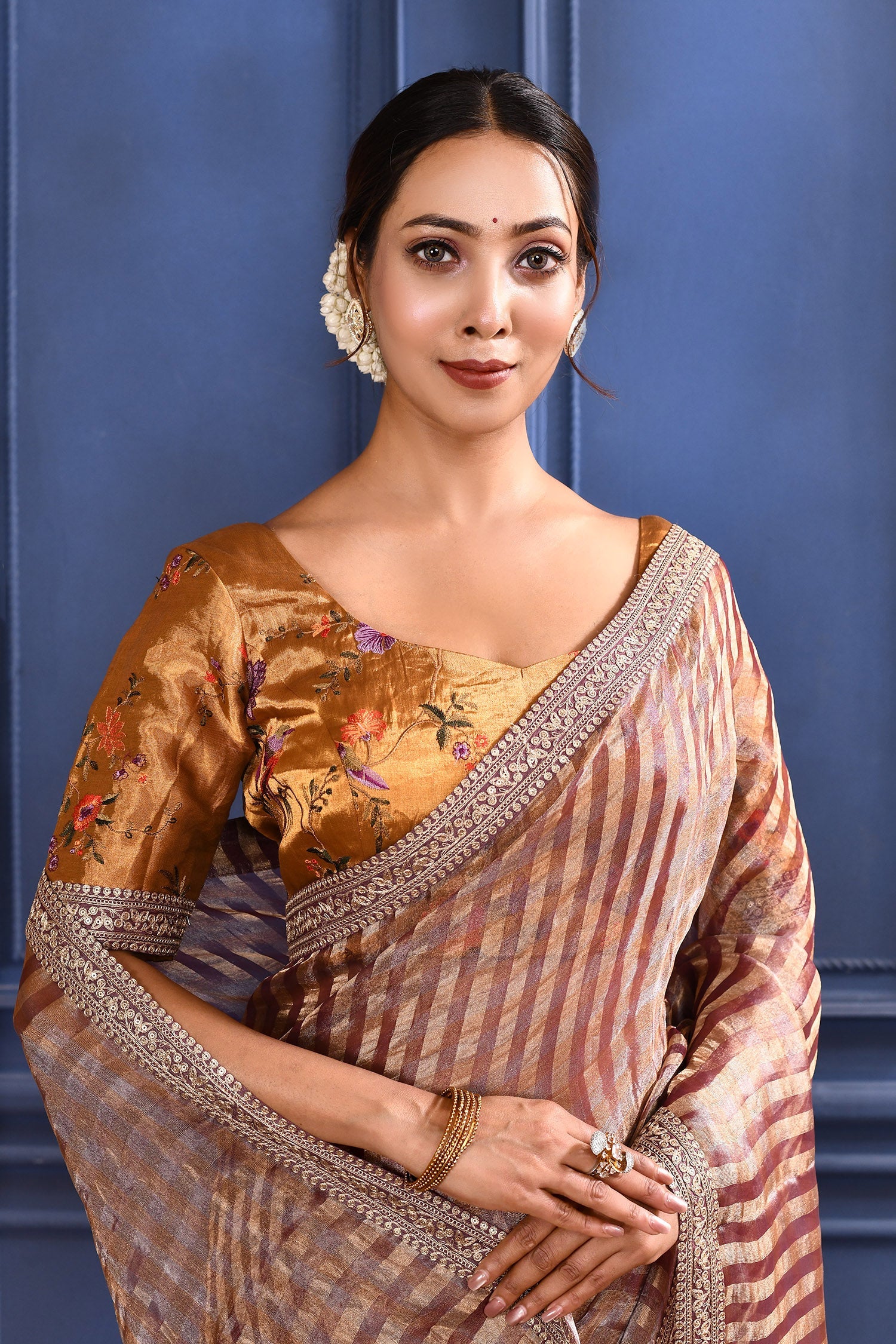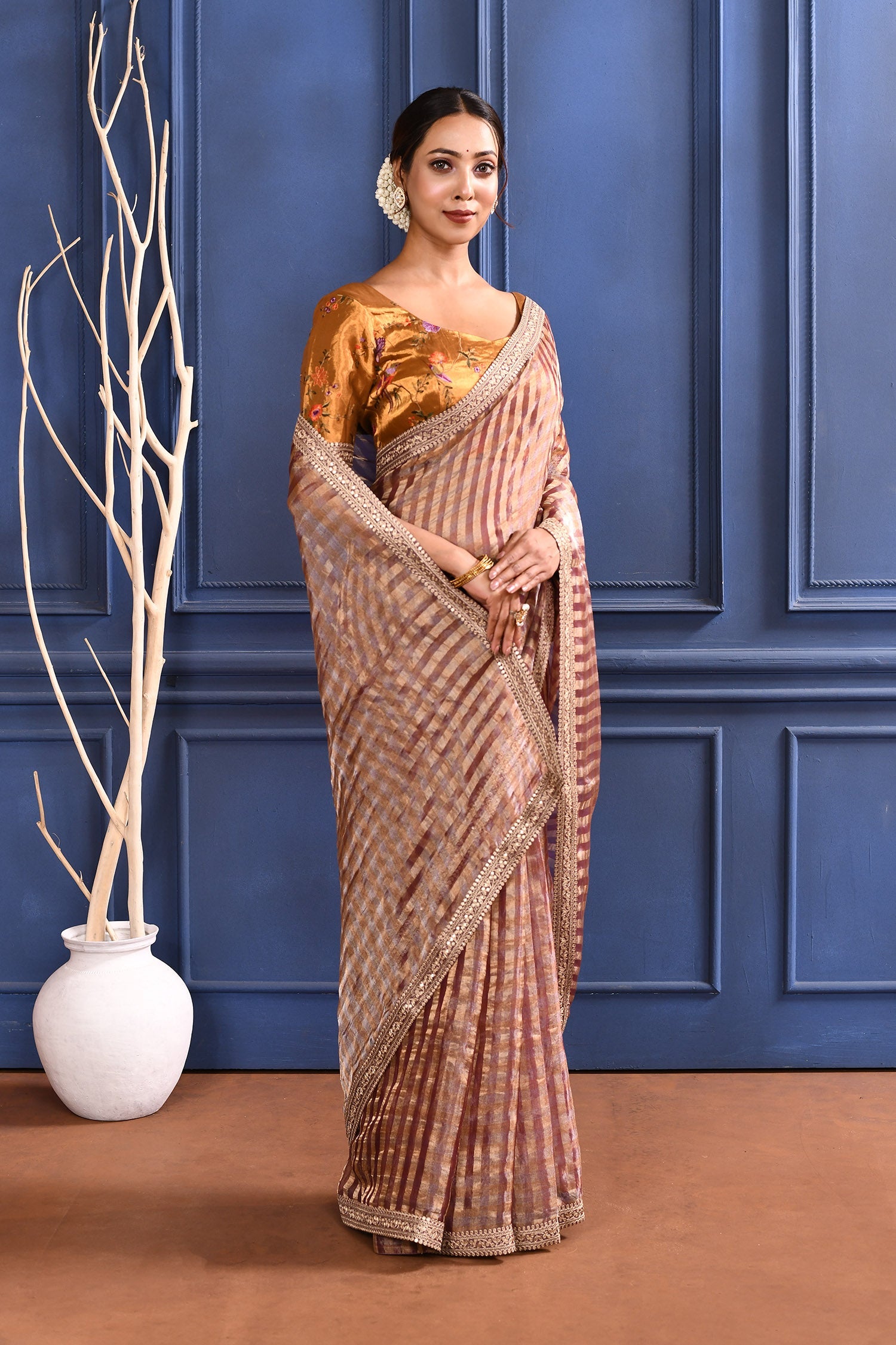 The earthy dark pink tissue saree with stripes and embroidered border along with stitched embroidered golden blouse for a stylish look with traditional elegance.