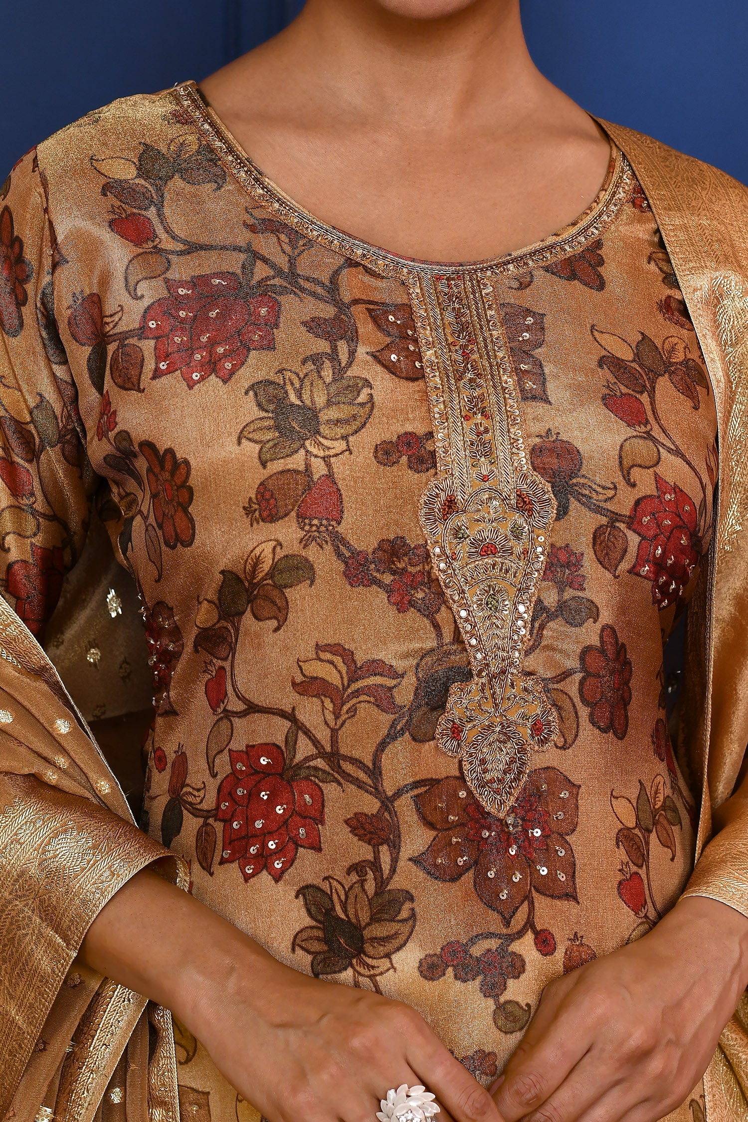 Earthy Gold Floral Printed Tissue Kurta Set