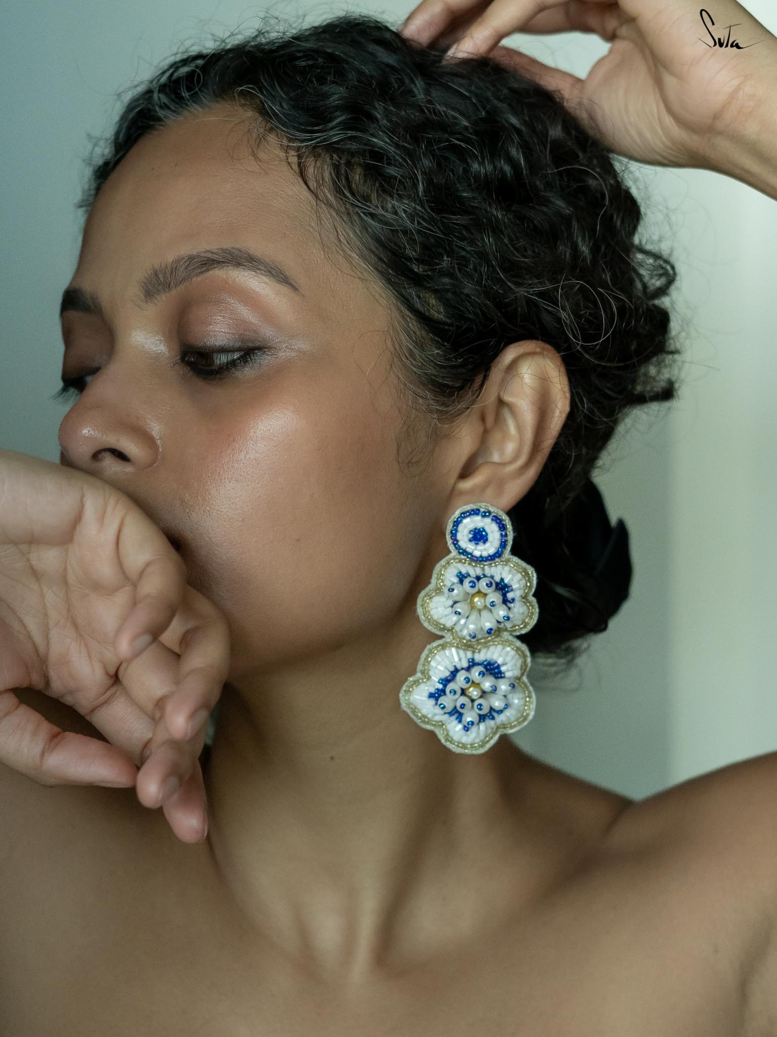 Sparkle and shine with the sparkling ECLAT ear ring, a pair of handcrafted floral earrings adorned in white and blue shades. Featuring zardosi threadwork all over the body, these hand-embroidered pieces transform every simple look into a glamorous ensemble.
