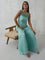 Dramatic yet delicately feminine, this aqua jumpsuit is crafted in fluid fabric that moves like liquid. The sheer yoke draws the eye with intricate bead and sequin embroidery in peacock-inspired tones, forming a striking neckline detail that feels both modern and regal. The sleeveless cut and wide-leg silhouette elongate the frame while keeping the look effortless.